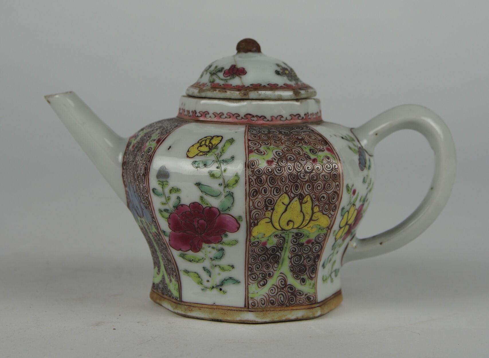 - porselein, famille rose-techniek (geel, blauw, groen, roze, rood, magenta en zwart)