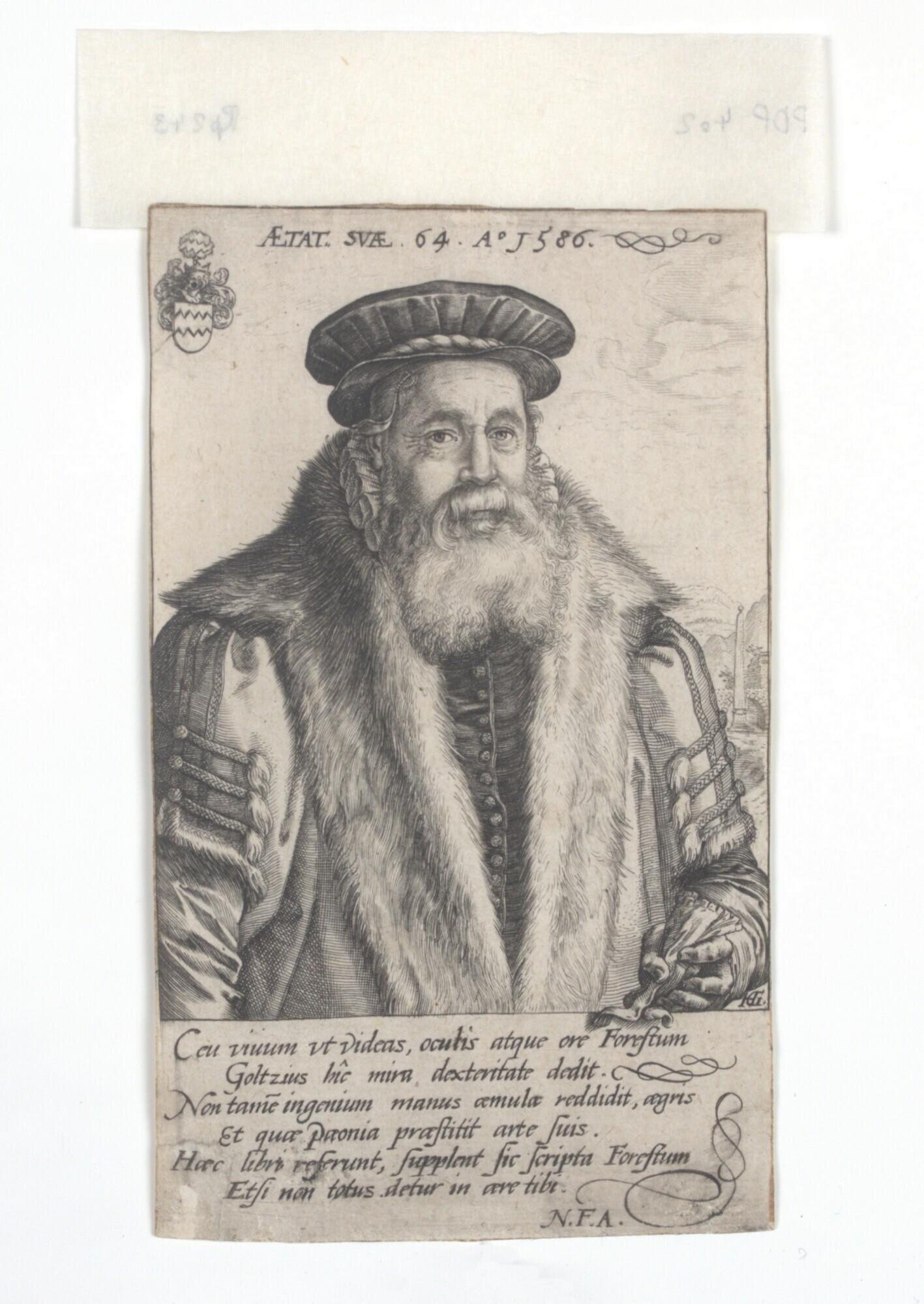 Gravure met een portret van Pieter van Foreest op 64-jarige leeftijd (1521-1597, geneesheer van Willem van Oranje). Portret ten halve lijve, van voren gezien, op 64-jarige leeftijd. Van Foreest is gekleed in een mantel afgezet met bont, een muts o...