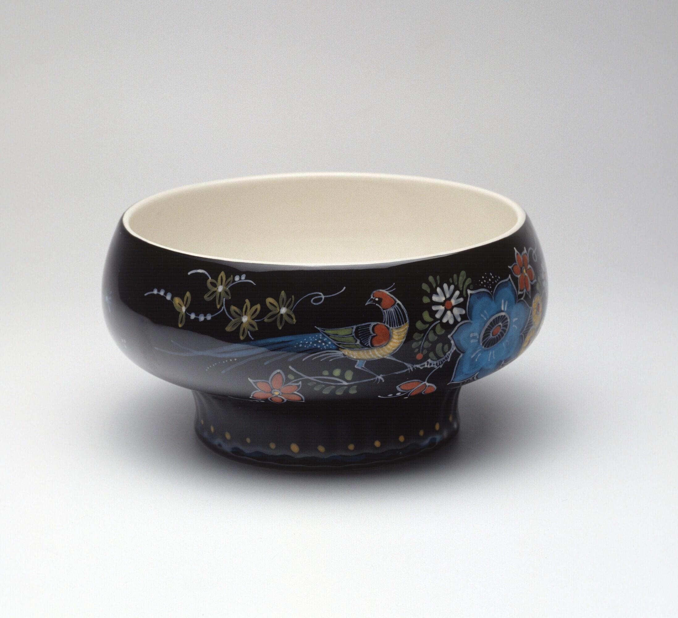 Een kom, zogenaamd Zwart Delfts met floraal decor op zwart fond. De kom heeft een brede geribbelde voet. Voorzijde versierd met bloemmotief en een vogel op tak. Aan de achterzijde siertakjes. Voet versierd met concentrische ring en stippen.