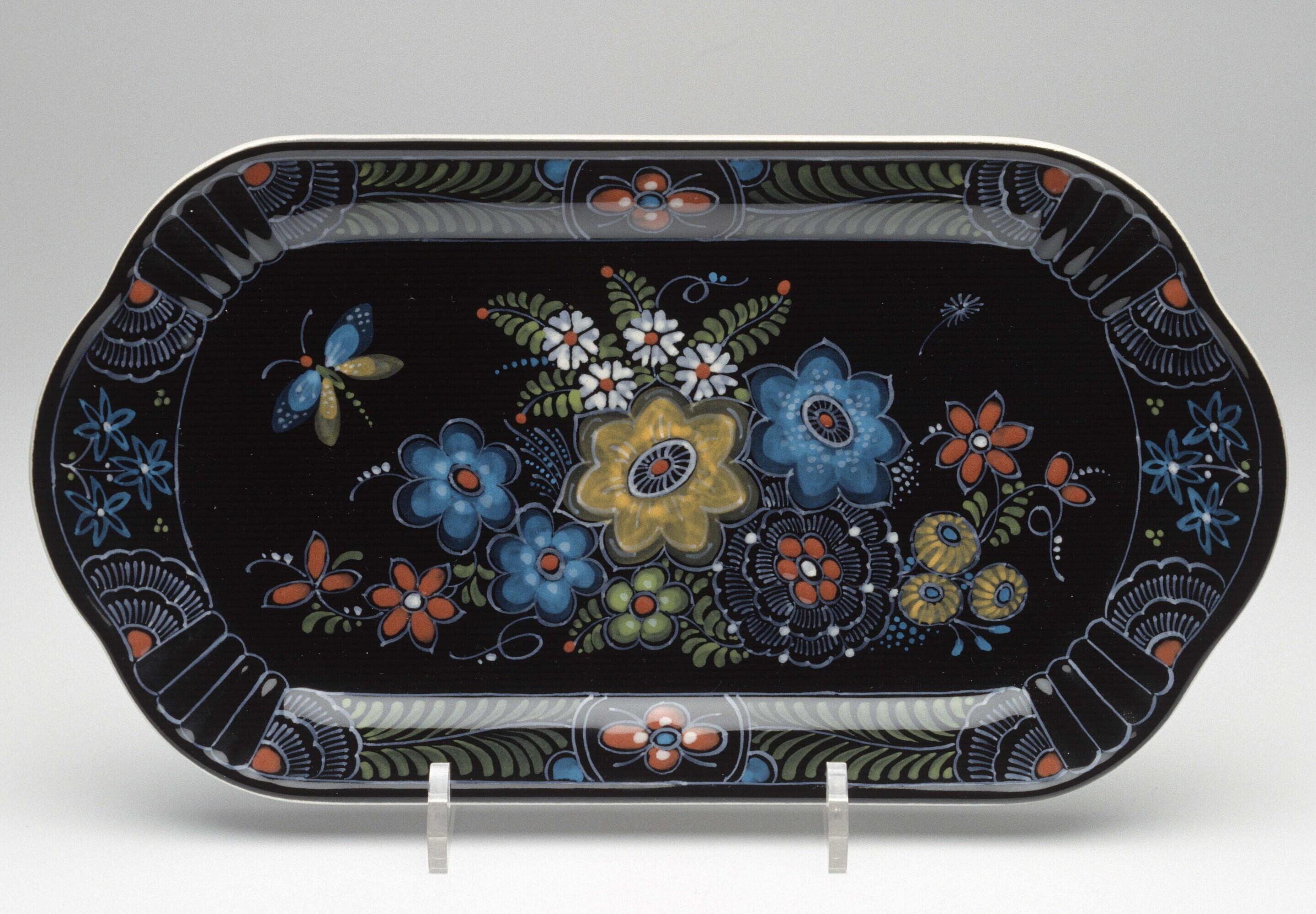 Een langwerpige schaal, zogenaamd Zwart Delfts met floraal decor op zwart fond. De schaal heeft ronde hoeken en boogvormige korte zijden. Decoratie aan de rand met bloemmotieven en in het midden bloemmotieven en een vlinder.