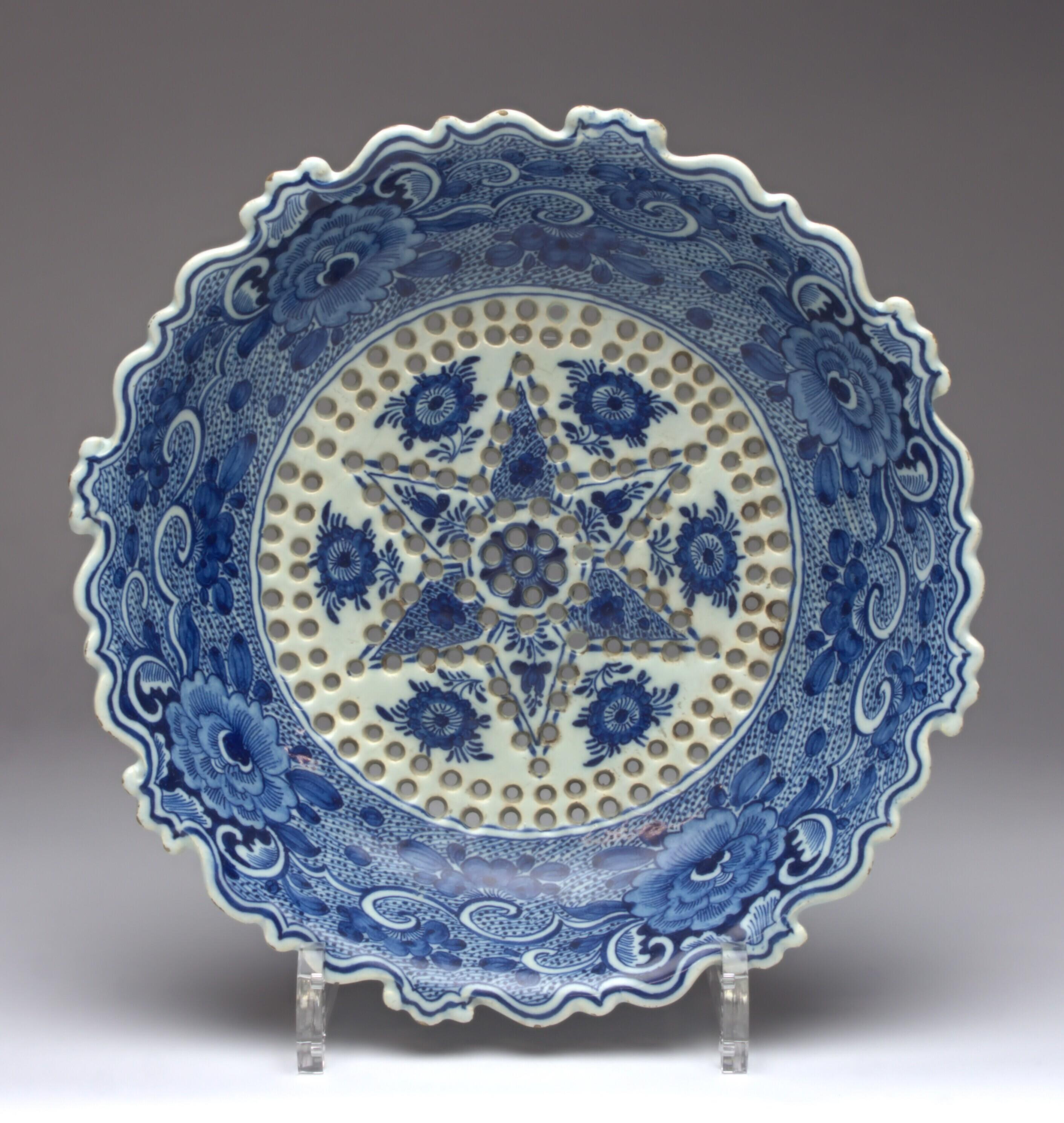 Fruittest, onderschotel ontbreekt, met gekartelde rand, rustend op drie pootjes, met in plat zespuntige ster met bloemmotief tussen de punten, en voorzien van lekgaatjes. Rand met bloemmotief, lofwerk en stippen. Op de onderzijde bladornamenten....