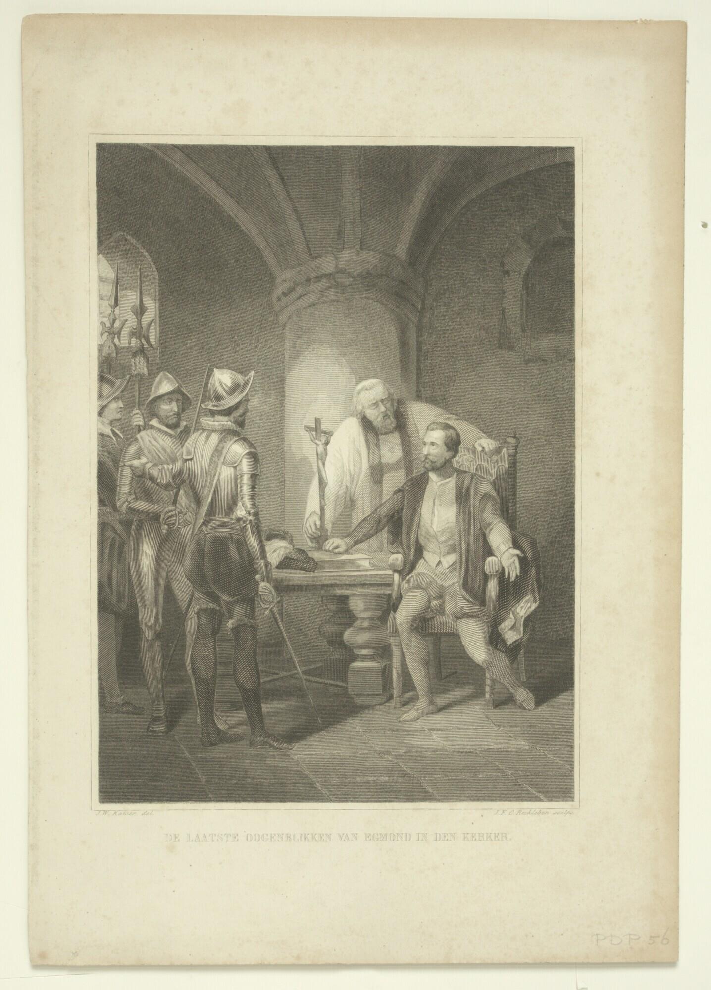De laatste ogenblikken van de graaf van Egmond in zijn cel, vóór zijn terechtstelling op 5 juni 1568. Egmond zit aan tafel bij een kruisbeeld, achter hem een priester, links soldaten.