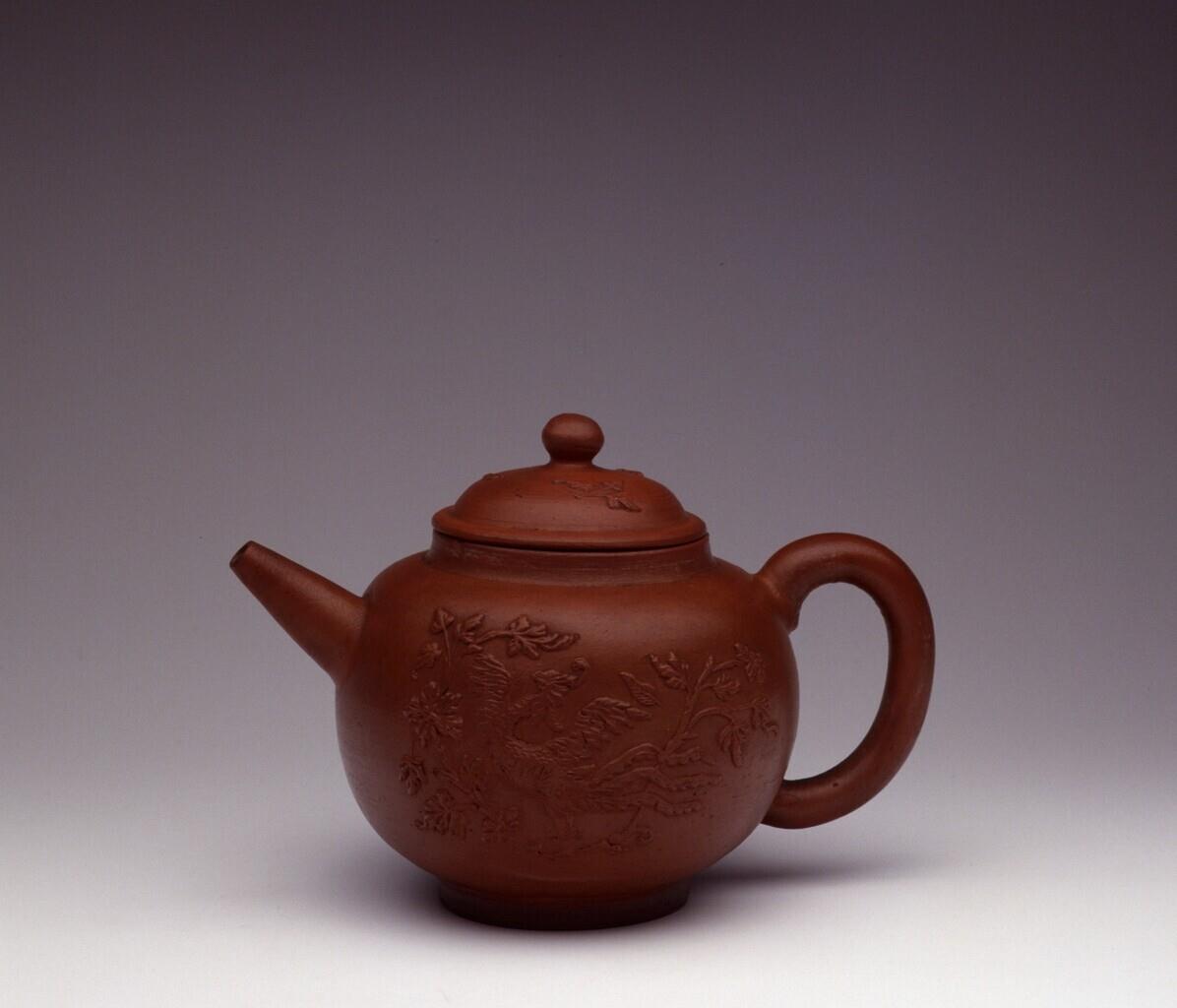 De bolle pot is voorzien van een korte rechte tuit en een oorvormig handvat. De voorstelling op de buik is in laag reliëf aangebracht en bestaat uit de vogel Phoenix tussen bloeiende takken. Het licht gewelfde deksel is versierd met takjes en voor...