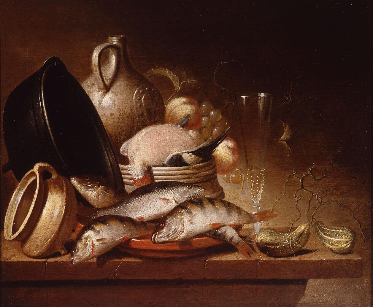 Stilleven met vis, kookpot en andere objecten