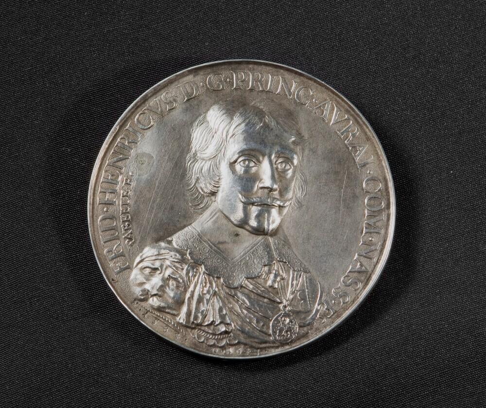 Penning met op de voorzijde een geharnaste buste van Frederik Hendrik omhangen met de Orde van de Kouseband en het omschrift: 'FRID.HENRICUS D.G.PRINC.AURAI.COM.NASS.EC. N. 1584. O. 1647'