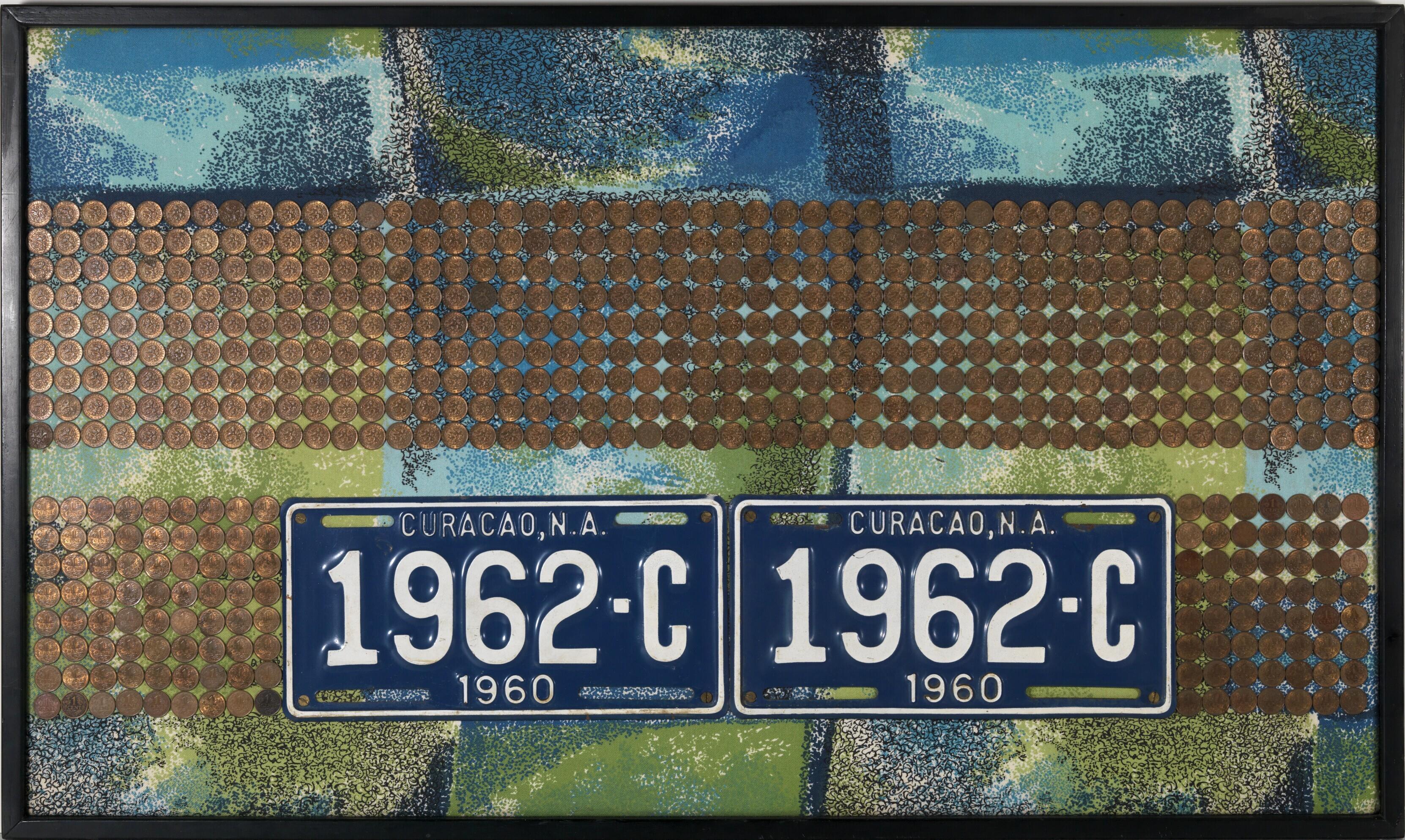Op een met bedrukt textiel (in blauw en groen) bespannen paneel is een brede horizontale rij met opgeplakte antilliaanse centen uit 1965 geplaatst, met daaronder naast elkaar twee blauwe nummerborden met in daarop in wit 'Curacao, N.A. 1962-C, 196...