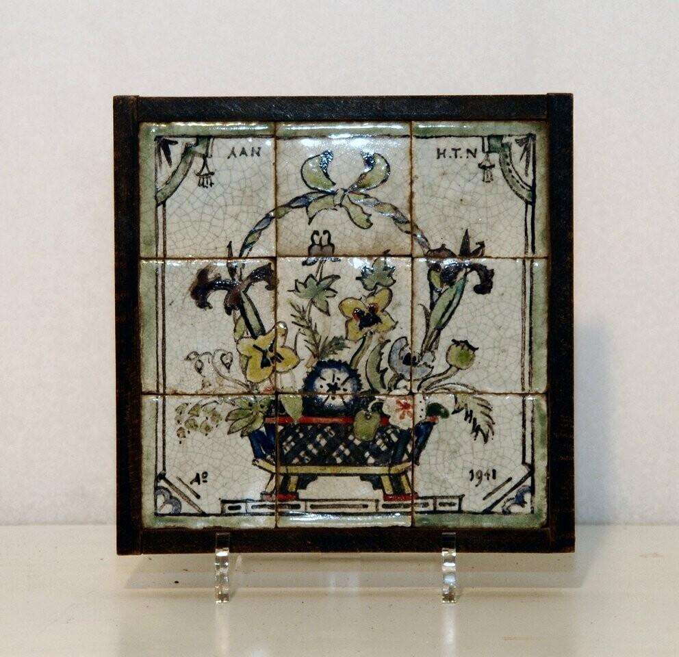 Tegeltableau bestaande uit 3 x 3 tegels met een voorstelling van een bloemenmand met opschrift 'aan H T A', aan Hugo Tutein Nolthenius.