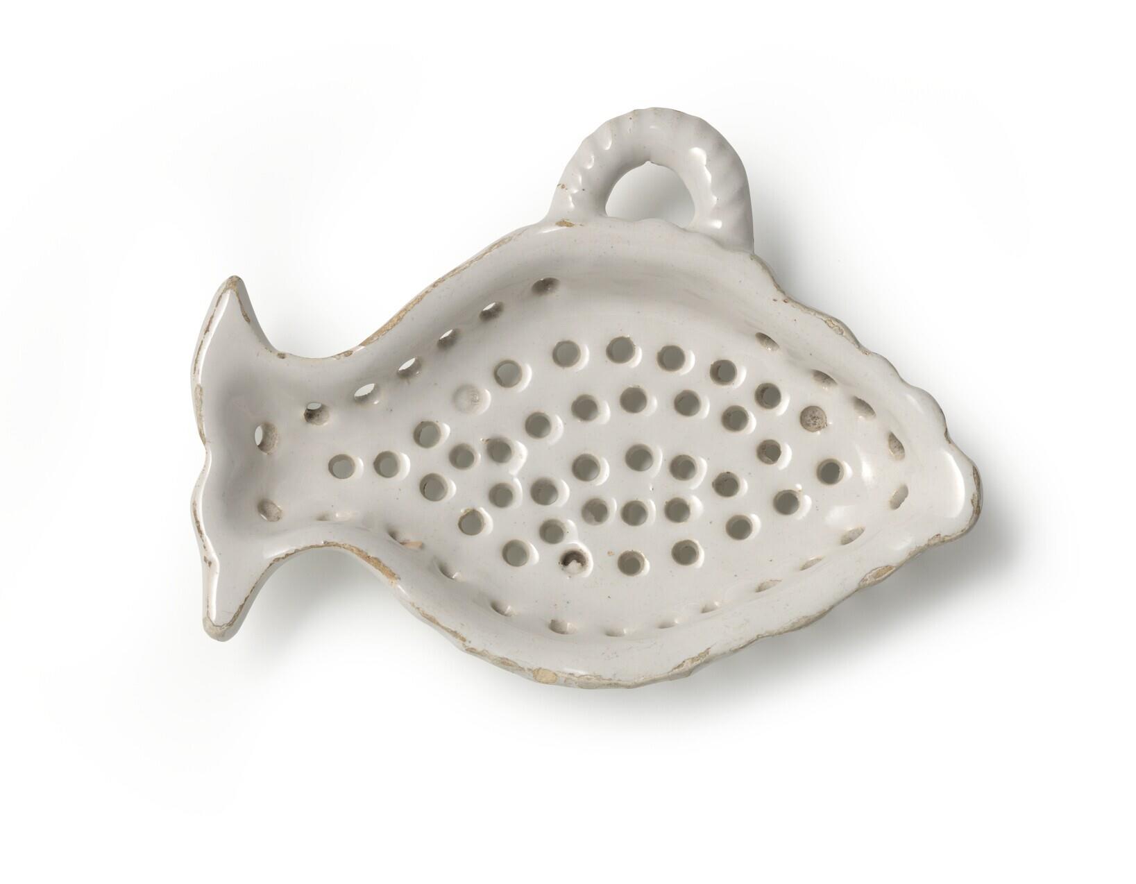 lekschaal in de vorm van een vis: ringvormige open handgreep; rustend op drie pootjes; ongedecoreerd.