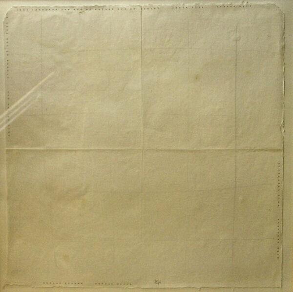 Beschrijving van het (kunst)werk: Vierkant vel wit papier met onregelmatige rand, rondom langs de rand betypt (met o.a. titel van het werk).