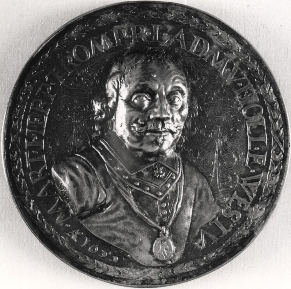 Penning met op de voorzijde borststuk van Maerten Harpertsz. Tromp omhangen met de ordeteken van Sint Michaël met terzijde gegraveerde kronen en sierkrullen. Met omschrift: 'MART HERP TROMP R I ADM V HOLL E WESTV Ao 1653' en randring bestaande uit...