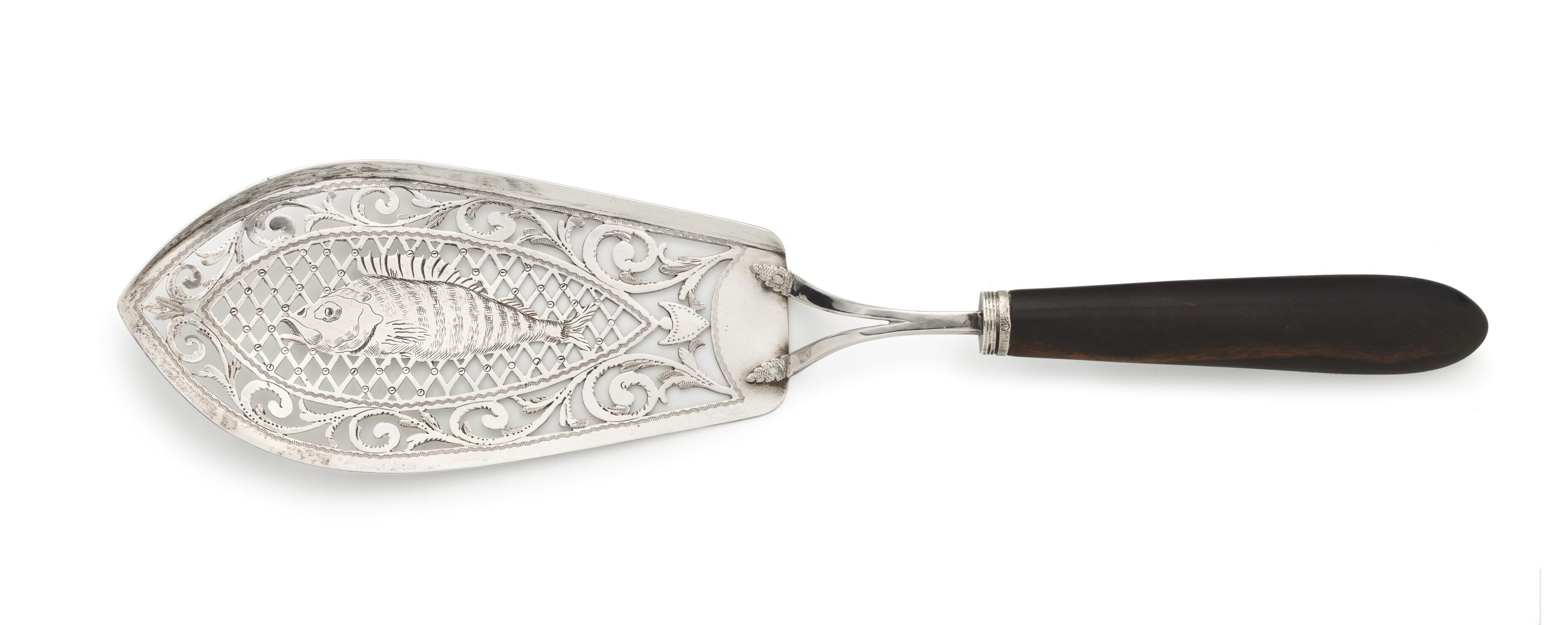 Gegraveerde baars in ajour bewerkt fond, die een visnet voorstelt. Het visnet is omgeven door een rank.