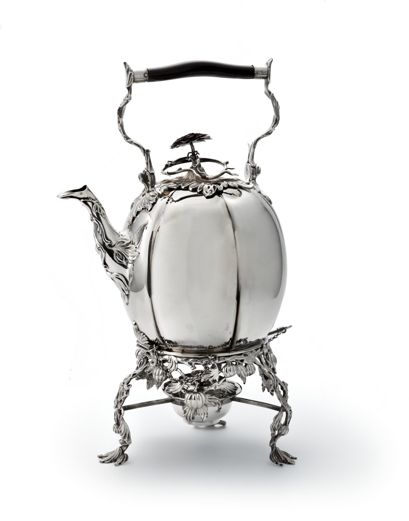 Bouilloir (kraantjeskan)in de vorm van een kalebas, de deksel in de vorm van een onorganisch blad, met bloem als knop. Het hengsel is aan takjes en bladeren bevestigd. Het onderstel, dat op drie pootjes van bladwerk rust, bestaat uit een onorganis...