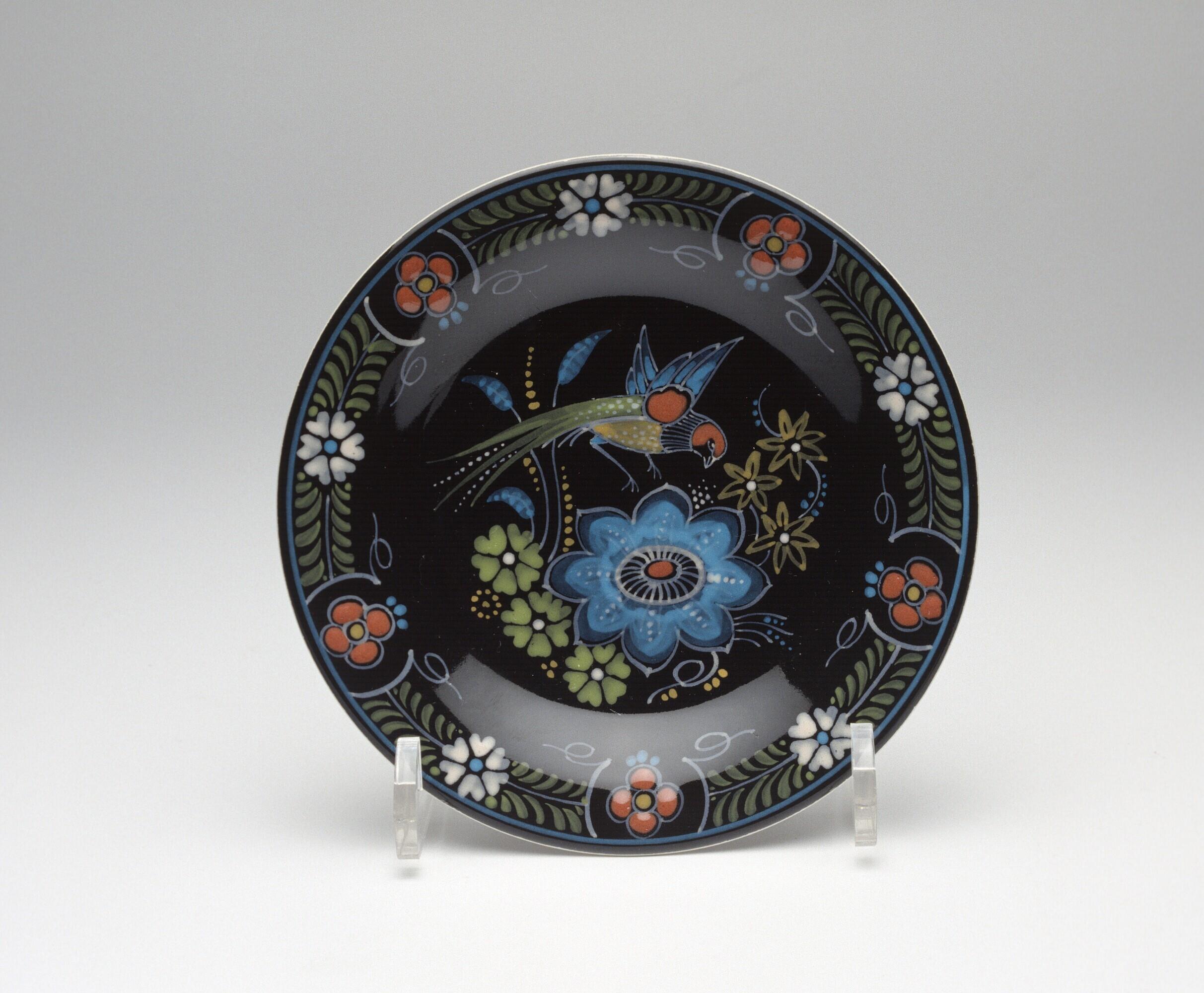 Een rond bord, zogenaamd Zwart Delfts met floraal decor op zwart fond, op standring. Decoratie aan de rand met bloemmotieven en in het midden bloemmotieven en een vogel.
