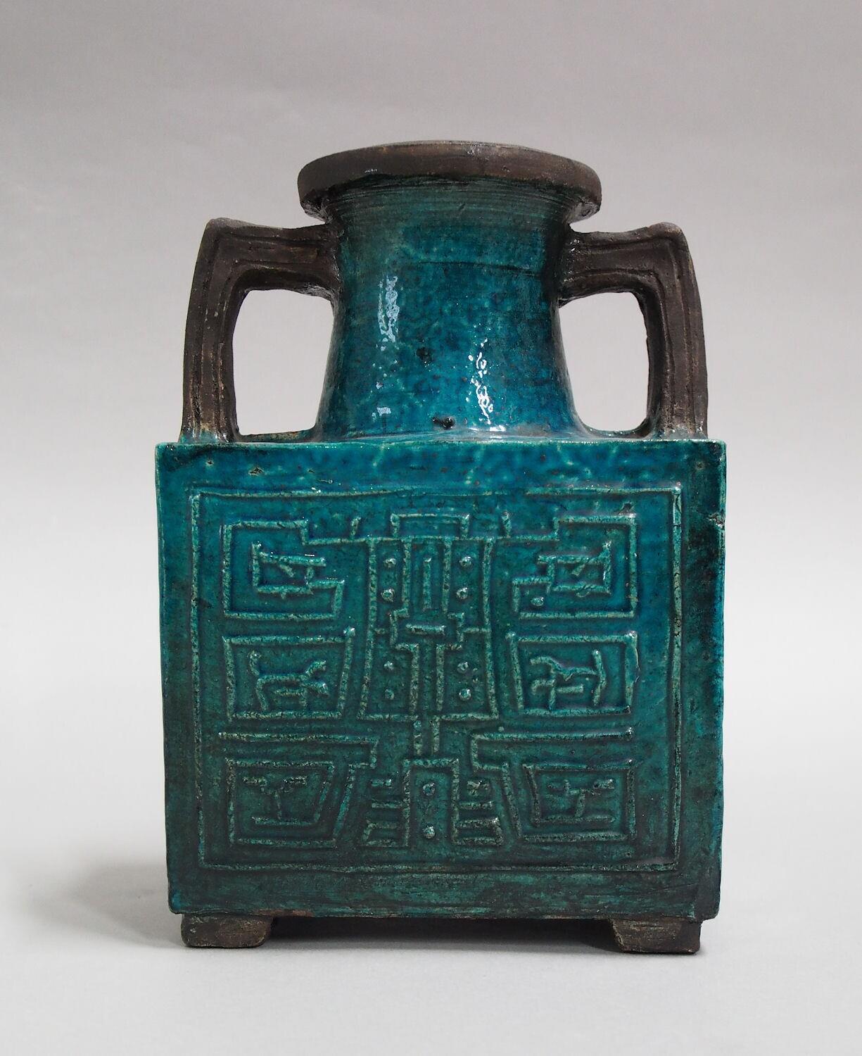 blauwgroene rechthoekige pot, rustend op 4 pootjes, met twee oren aan ronde hals en reliëf-decoratie
