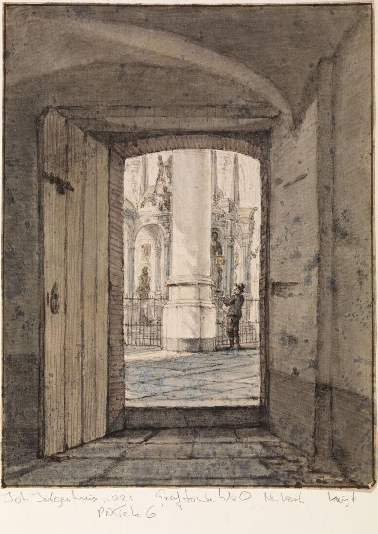 Tekening van het graf van Willem I gezien vanuit het kleine kerkhofsdeurtje.