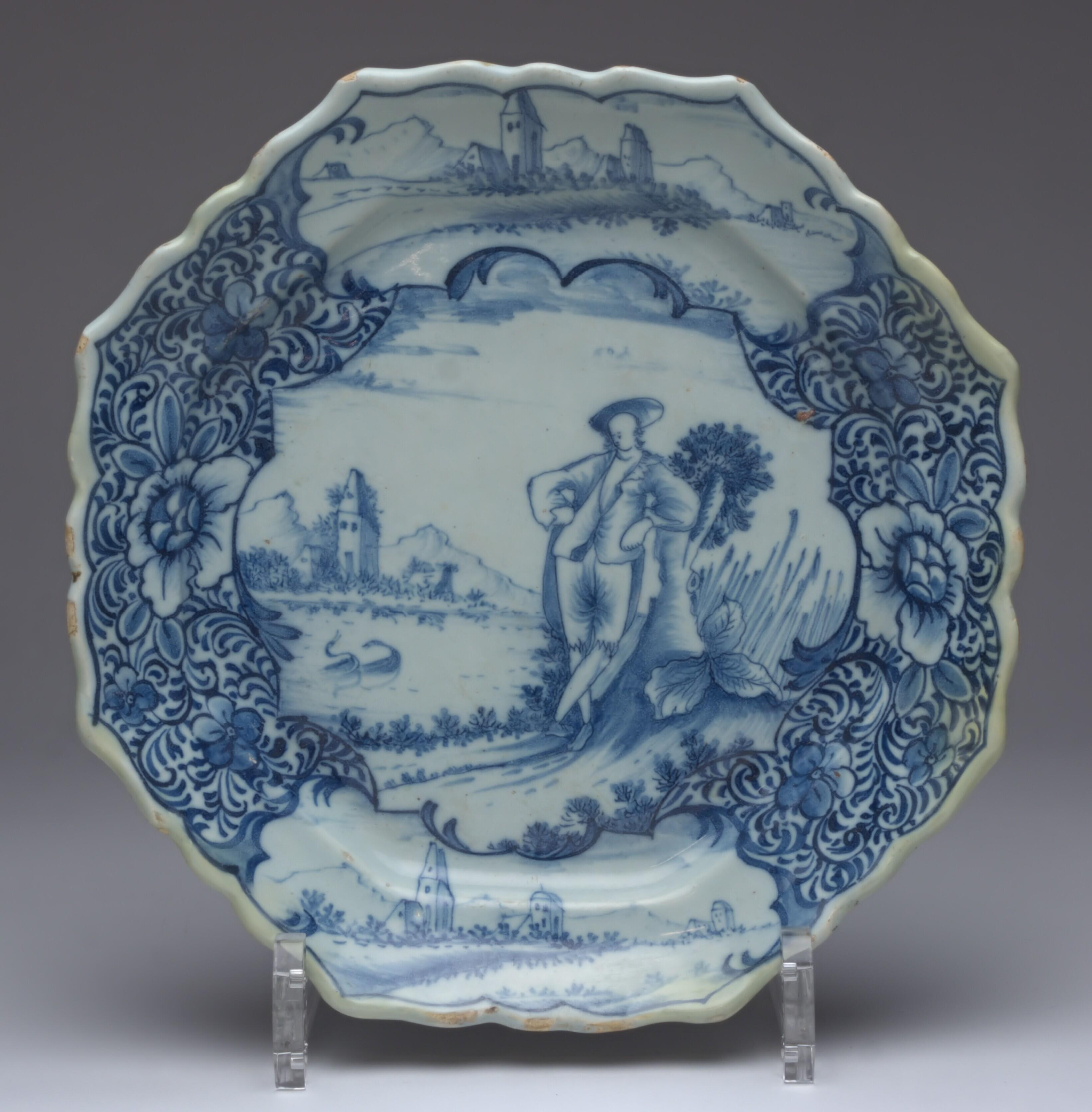 Onderschotel van fruittest, achtzijdig met accoladerand. Op het plat een elegante, staande man nabij waterpartij met twee zwanen, achtergrond heuvels met gebouwen. Op de rand (boven- en onderzijde) herhaling van achtergrondlandschap, verder opgevu...