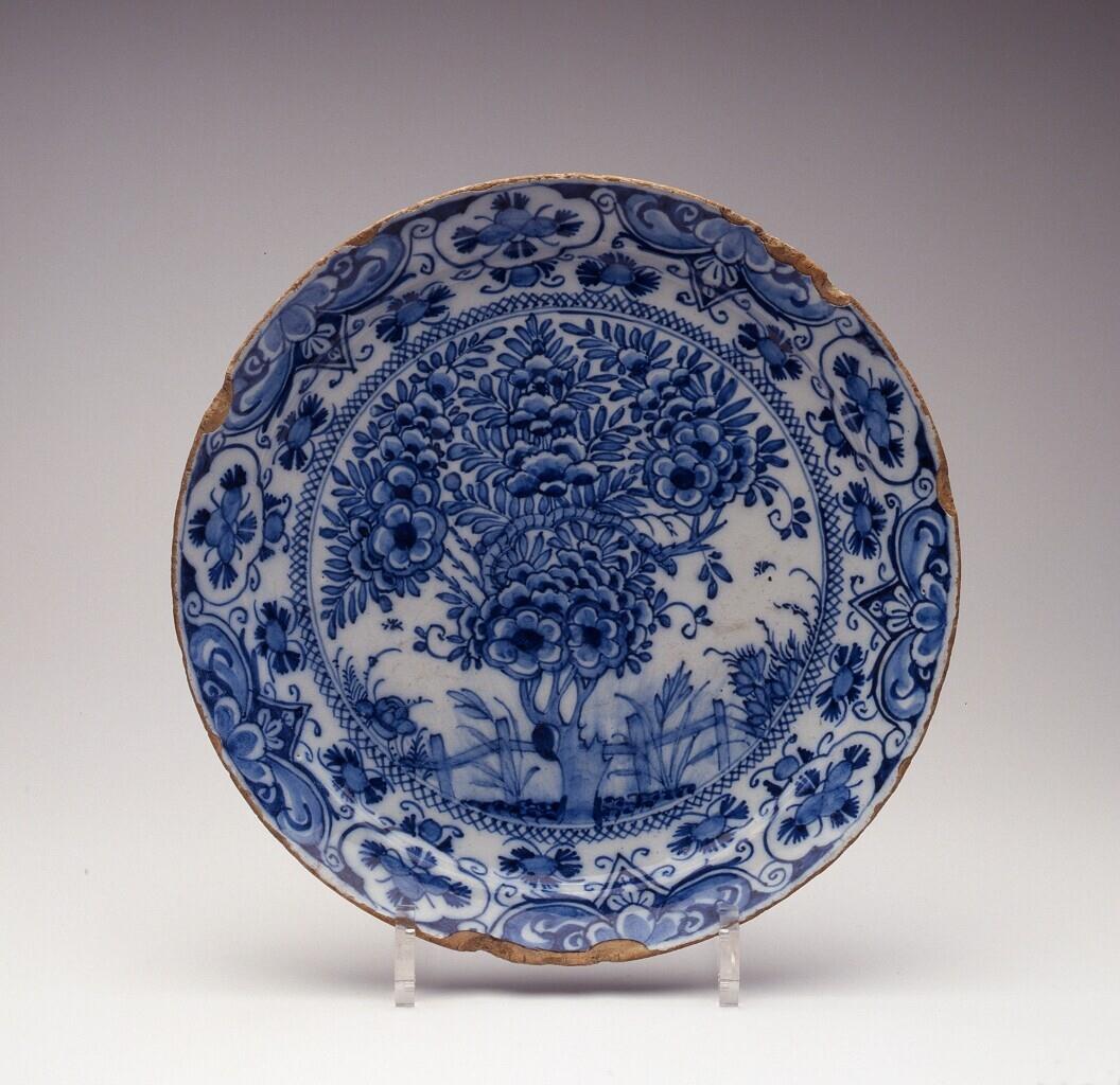 Bord, met standring, met op het plat gedecoreerd met een gestileerd weergegeven, bloeiende zogenoemde theeboom voor een hekje. De voorstelling wordt omgeven door een kruisjesband. De rand toont vijf medaillons met bloemwerk. De vakken daartussen z...