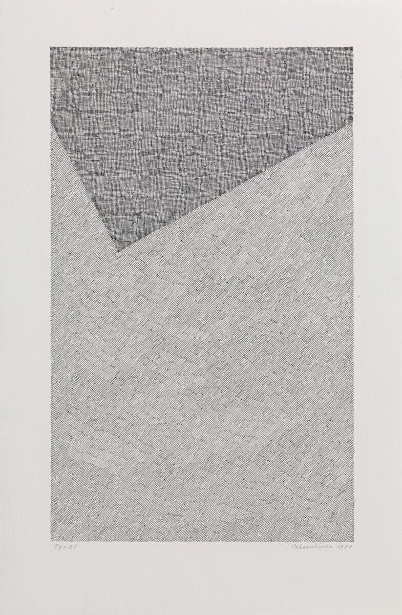 Een lichtgrijs vlak, bestaande uit smalle strookjes diagonale arceringen. Een gedeelte van de bovenste helft van het werk bestaat uit kleine 'lapjes' van over elkaar geplaatste horizontale en verticale arceringen. Dit gedeelte is donkergrijs en st...