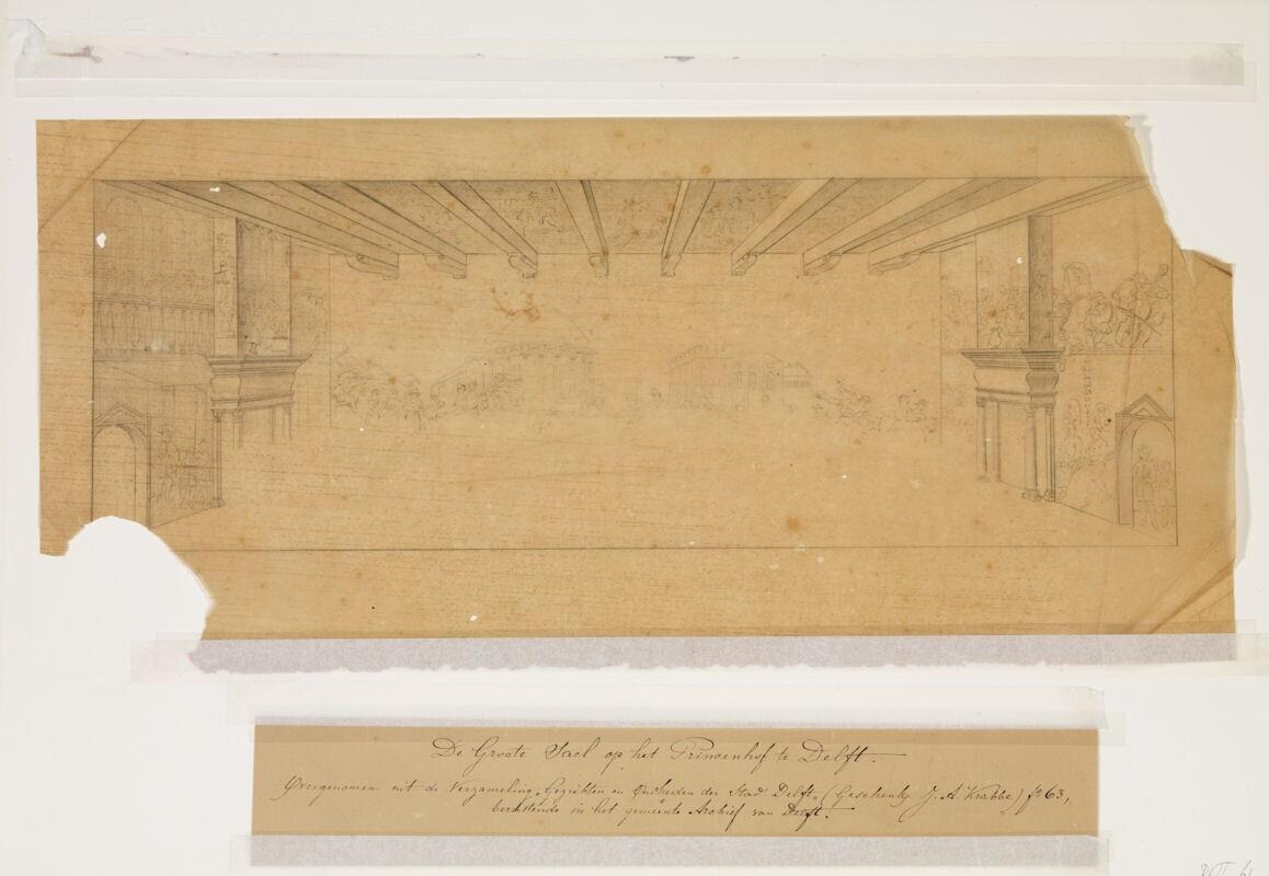 Op een bijbehorend los papier staat vermeld; 'De Groote Sael op het Princenhof te Delft' en 'Overgenomen uit de Verzameling 'Gezichten en Oudheiden der Stad Delft'