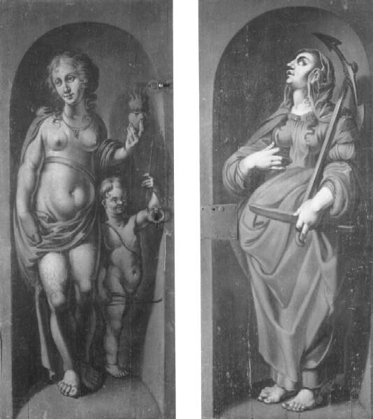 Deur waarop een beschildering van 'de Liefde' in gedaante van een vrouw ten voeten uit en aan de achterkant beschildering van 'de Hoop' in de gedaante van een vrouw ten voeten uit.
