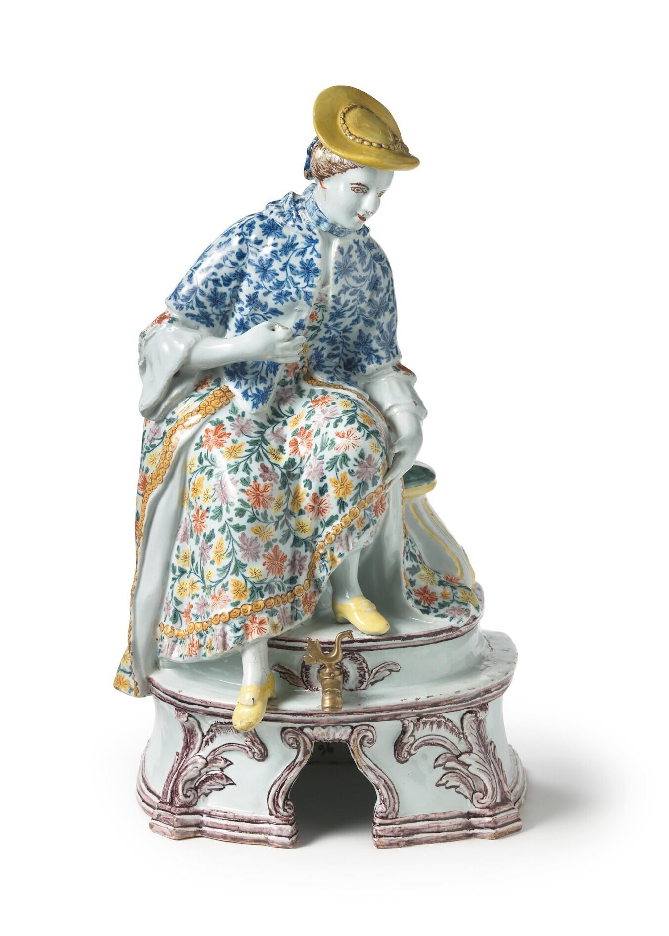Kraantjeskan in de vorm van een op een bank zittende dame op een tweetrapsgewijs verhoogd voetstuk met licht geschulpte wanden. Onder het afneembaar hoofddeksel bevindt zich een vulgat. Aan de voorkant op het voetstuk bevindt zich een kraan.