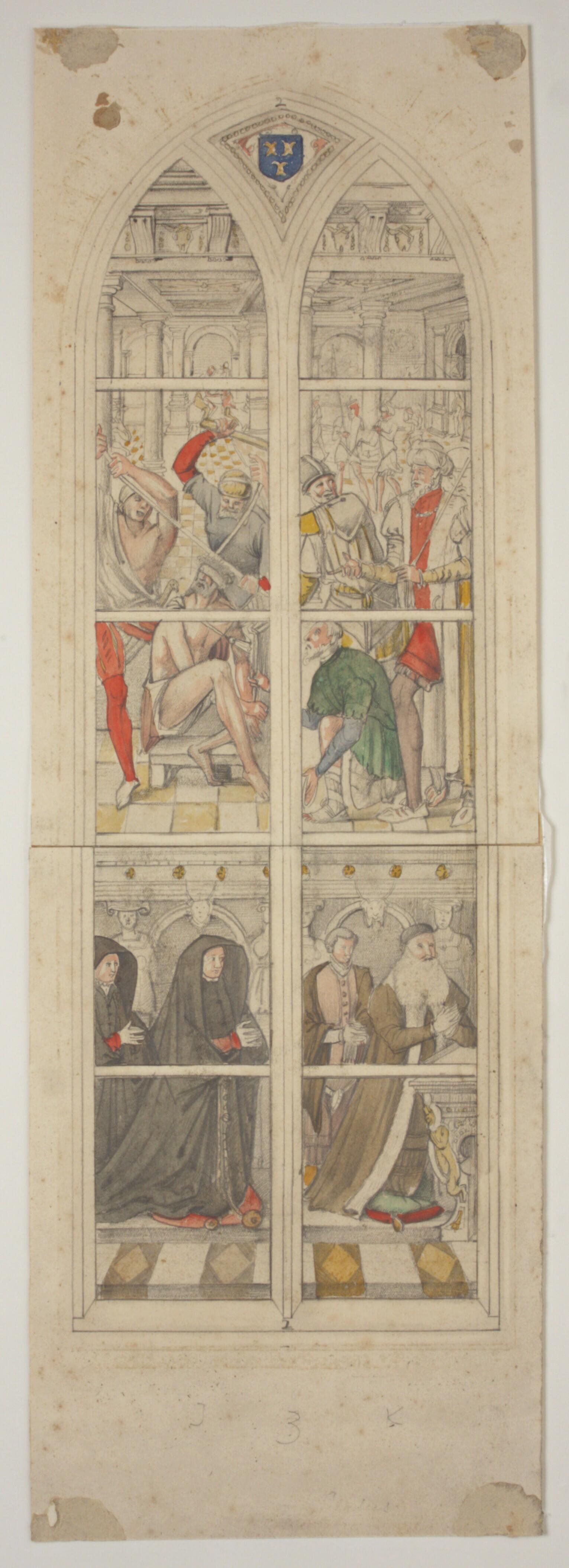 Ontwerptekening van een glas-in-loodraam met de geseling van Christus