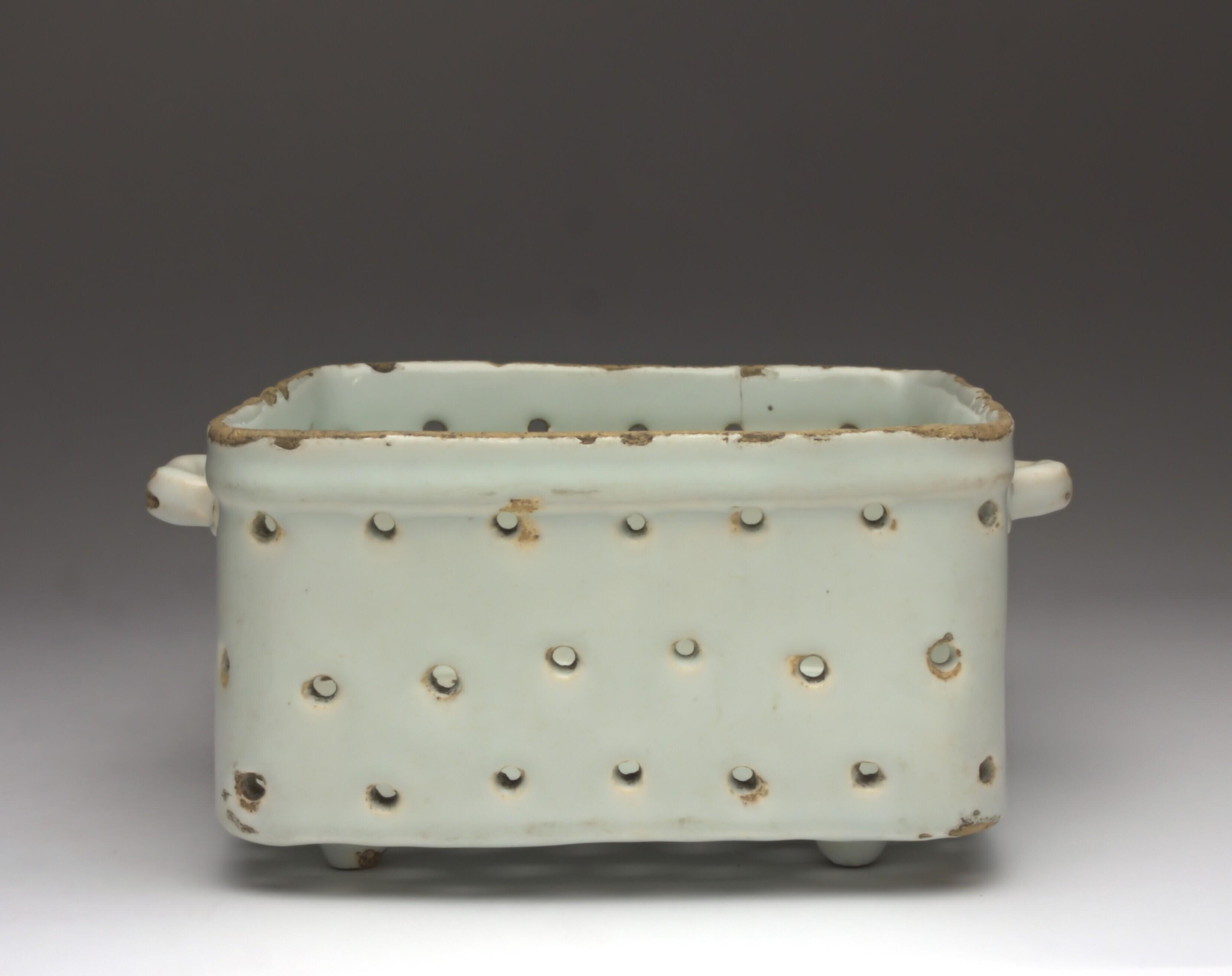 Bakvormige lekschaal; vierkant met verdikte bovenrand; twee U-vormige handgrepen en rustend op drie pootjes; ongedecoreerd.
