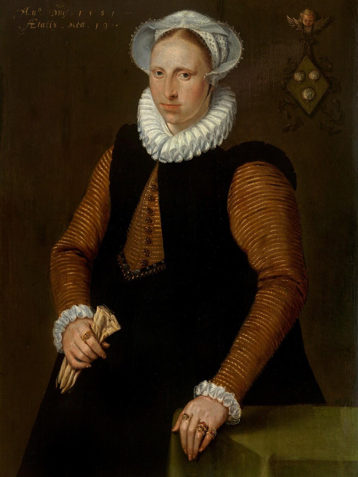 Portret van Anna Cool op 19-jarige leeftijd, heupstuk 'en trois-quarts' naar links, met de linkerhand steunend op een tafel en een paar handschoenen in de rechterhand. Zij draagt een wit kapje op het hoofd, een bruin met goud geweven jakje, zwarte...