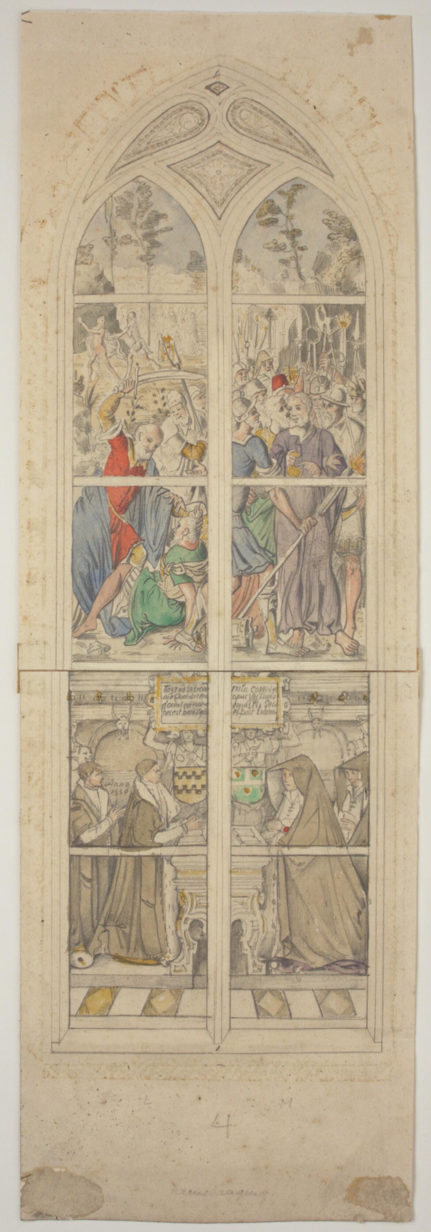 - Ontwerptekening van een glas-in-loodraam met de gevangenneming van Christus die wordt gekust door Judas.