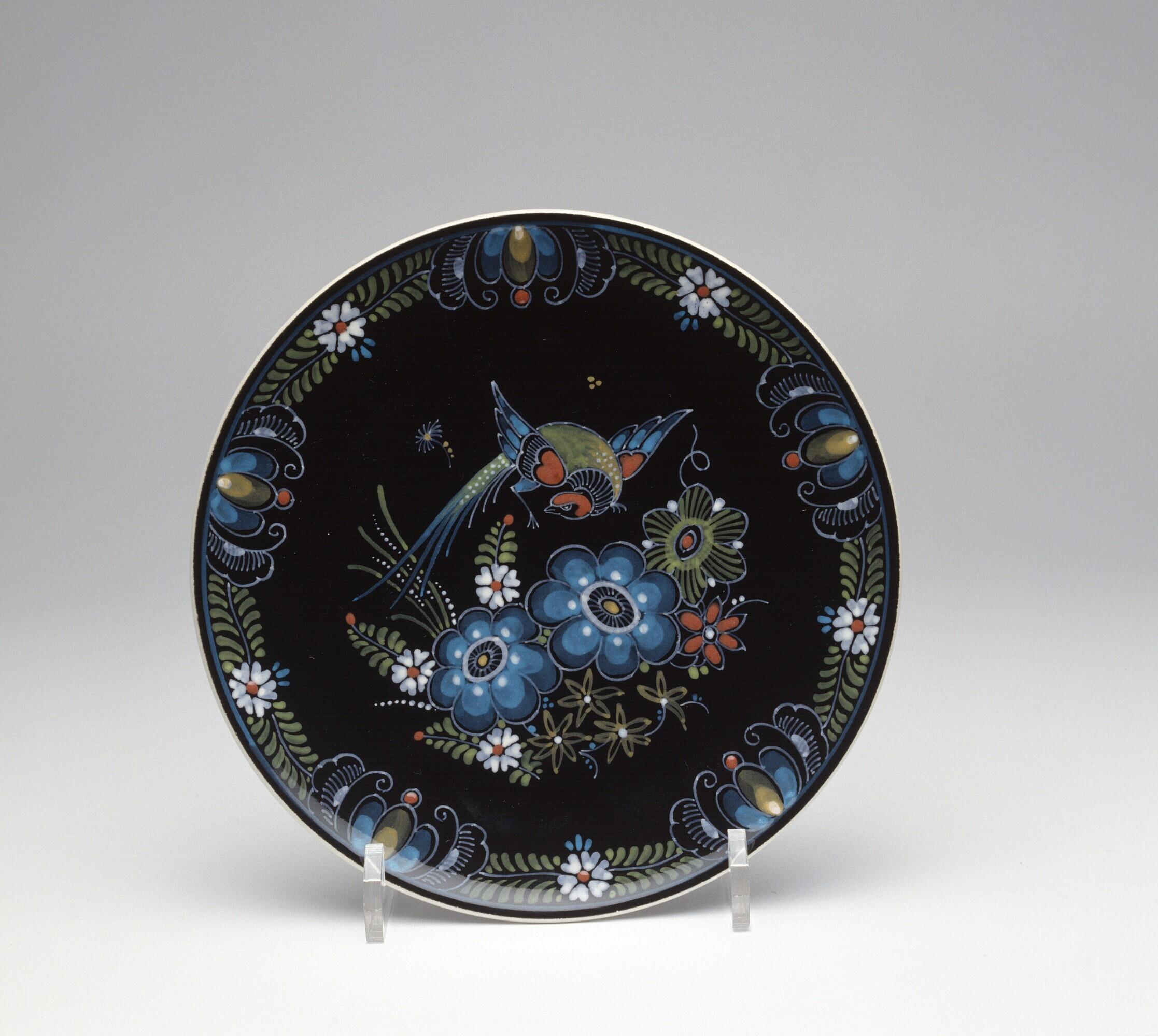 Een rond bord, zogenaamd Zwart Delfts met floraal decor op zwart fond, op standring. Decoratie aan de rand met bloemmotieven en in het midden bloemmotieven en een vliegende vogel.