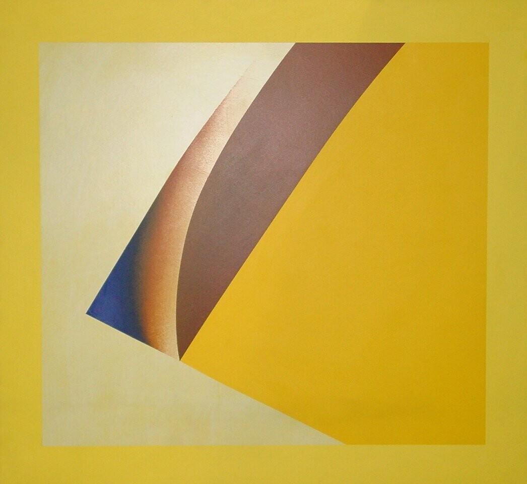 Een gele band als kader. Daarbinnen rechts een gele 'wig' met bruin/blauwe punt (naar links wijzend)' geplaatst tegen een lichtgele achtergrond.