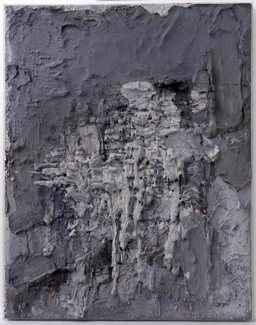 Div. grijstonen. Bovenste helft vrij egaal donkergrijs, midden en onder lichtere grijstonen, dik opgebracht, zodat relief ontstaat.
