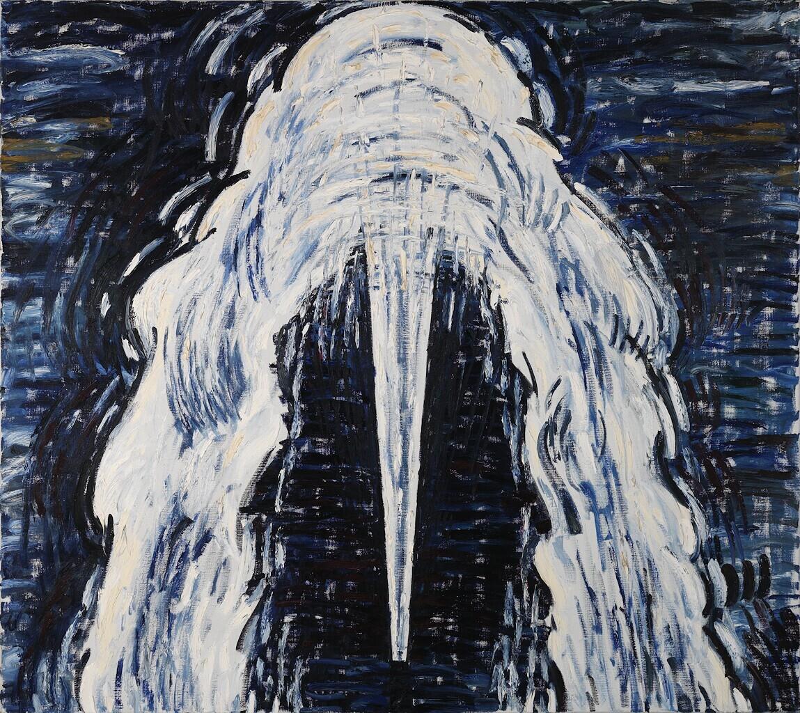 Het werk heeft een voornameljik donkerblauwe achtergrond, met accenten in donkerrood, donkergroen, oker en zwart. In het midden een smalle witte kegelvorm op de punt, boven overgaand in twee brede golvende banen die links en rechts van de kegel di...