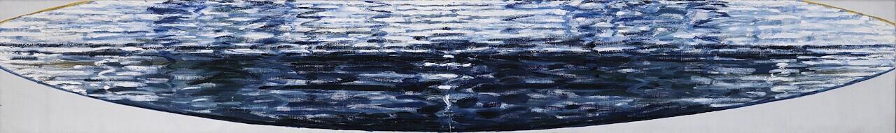 Langwerpige, horizontaal geplaatste, ellips, aan drie kanten afgesneden door de rand van het doek. De restruimte om de ellips is wit. Boven langs de ellips loopt een gele, en onderlangs een blauwe streep. De ellips is opgevuld met donkerblauwe en ...