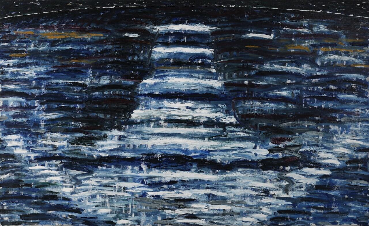 Een beweeglijk geheel van blauwe en groen / turquoise verfstreken. Een basis van twee naar elkaar toe wijzende blauwe driehoeken, daartussen een brede horizontale blauwe streep met haaks daarop een verticale roze streep. Van daar uit onstaan blauw...