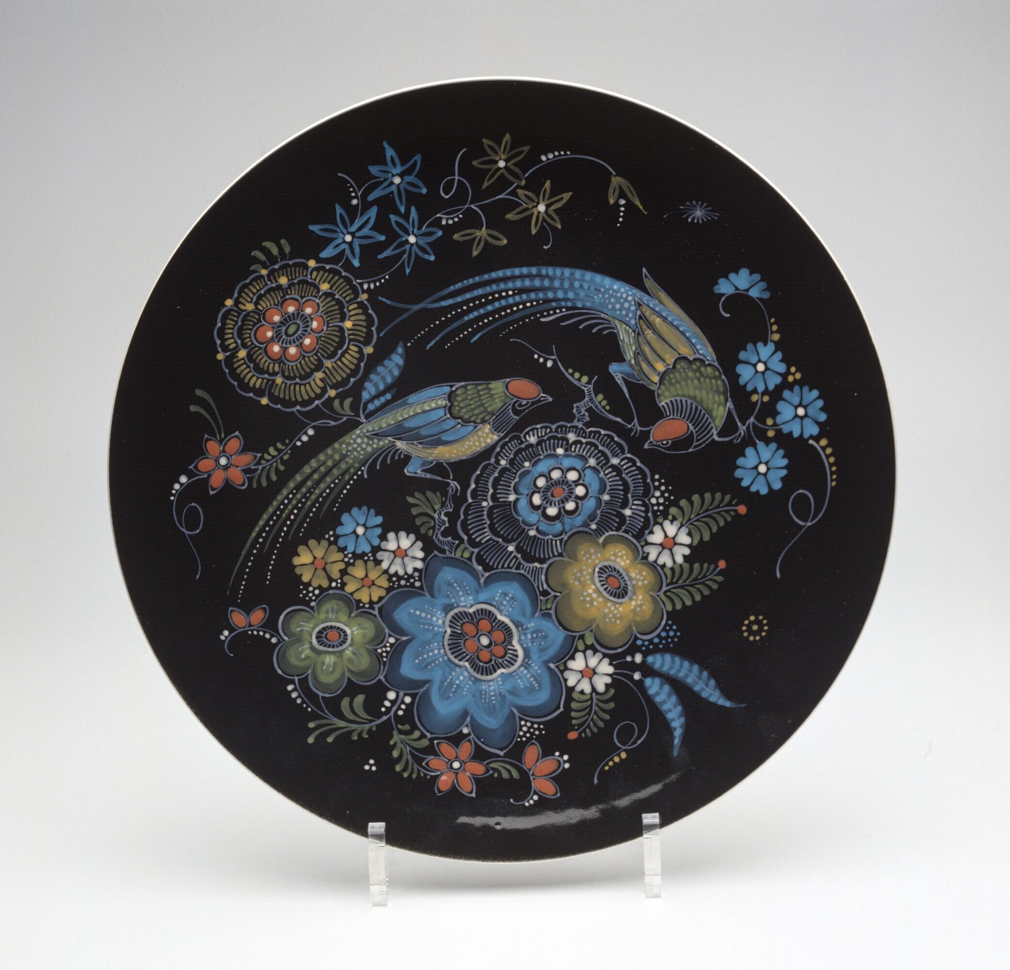 Een ronde schotel, zogenaamd Zwart Delfts met floraal decor op zwart fond, op standring. Decoratie met bloemmotieven en twee vogels.