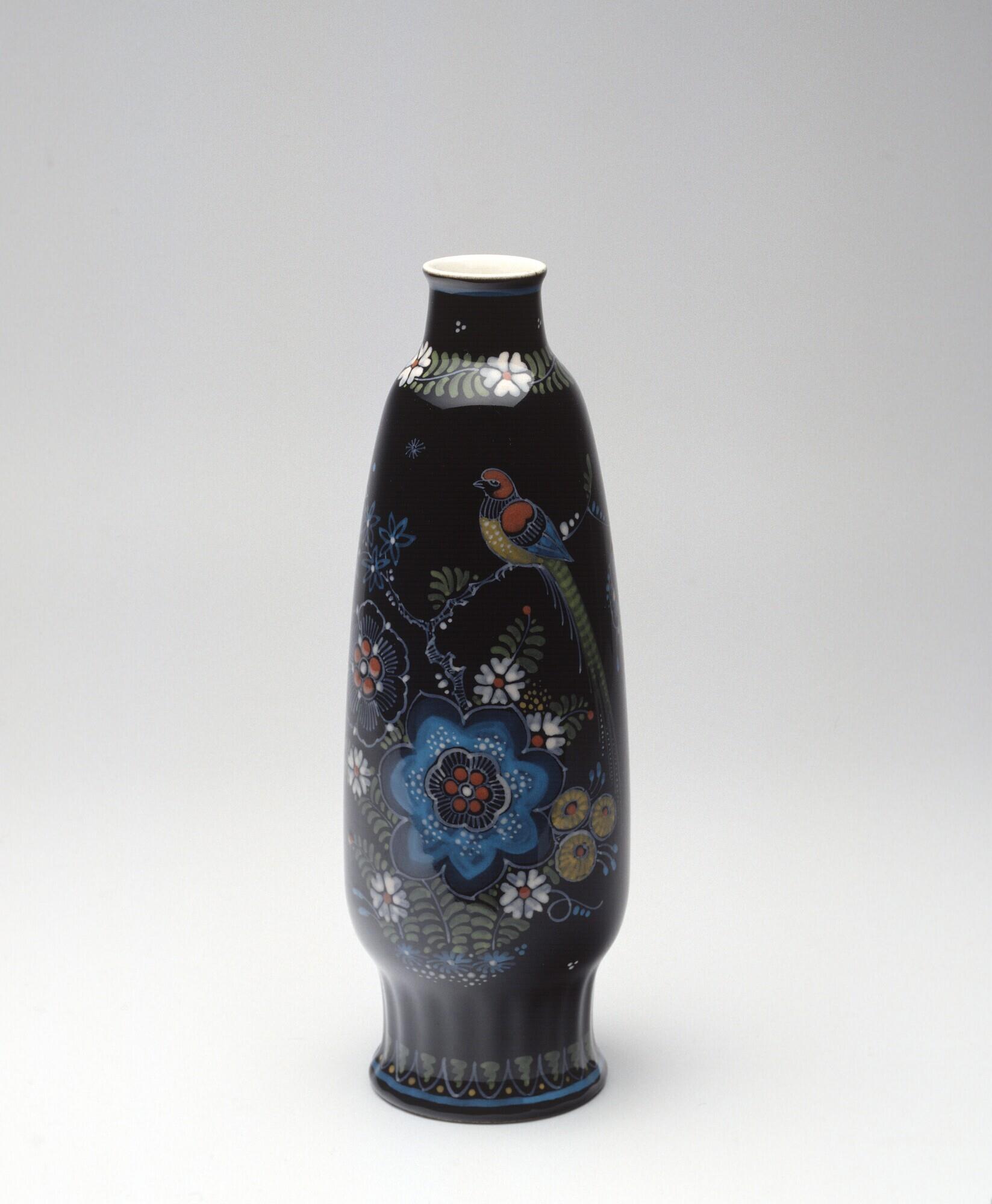 Een flesvormige vaas zogenaamd Zwart Delfts met floraal decor op zwart fond. Decoratie aan de voorzijde met bloemmotieven en een vogel op een tak. Op de hals en voet bloemmotieven.