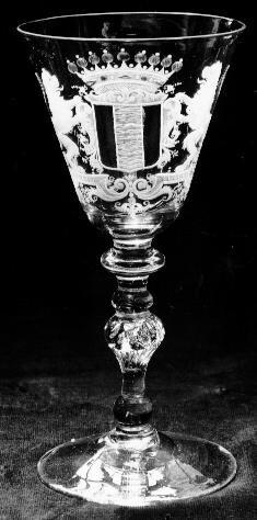 Wijnglas op oplopende voet en rechte, met knopen versierde stam; de middelste knoop is versierd met luchtbellen in de vorm van tranen. De kelk is gedrild met het gekroonde wapen van Delft, gebonden door twee klimmende leeuwen.