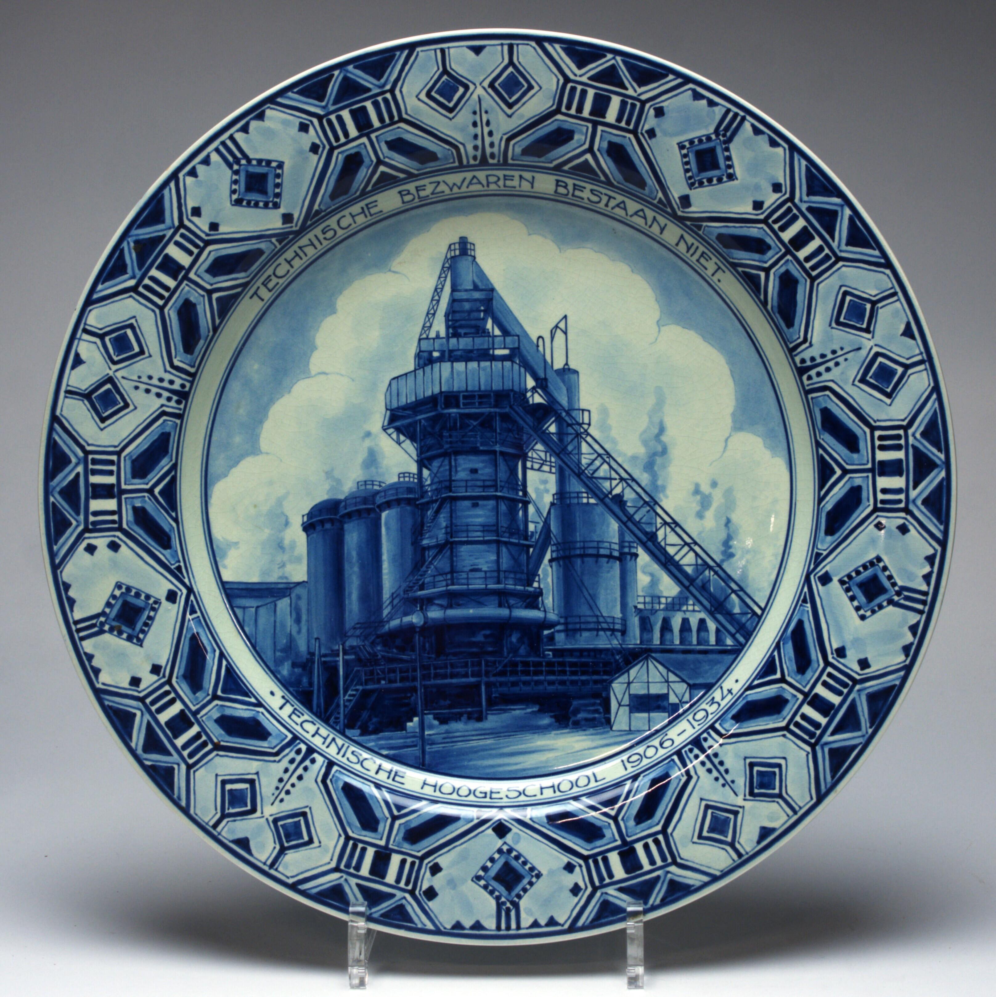 Ter gelegenheid van zijn afscheid als hoogleraar van de afdeling Mechanische Technologie werd in 1934 aan L.A. van Royen (1865-1946) deze schotel aangeboden waarnaar het opschrift verwijst. Hij was 28 jaar verbonden aan de Technische Hogeschool, d...