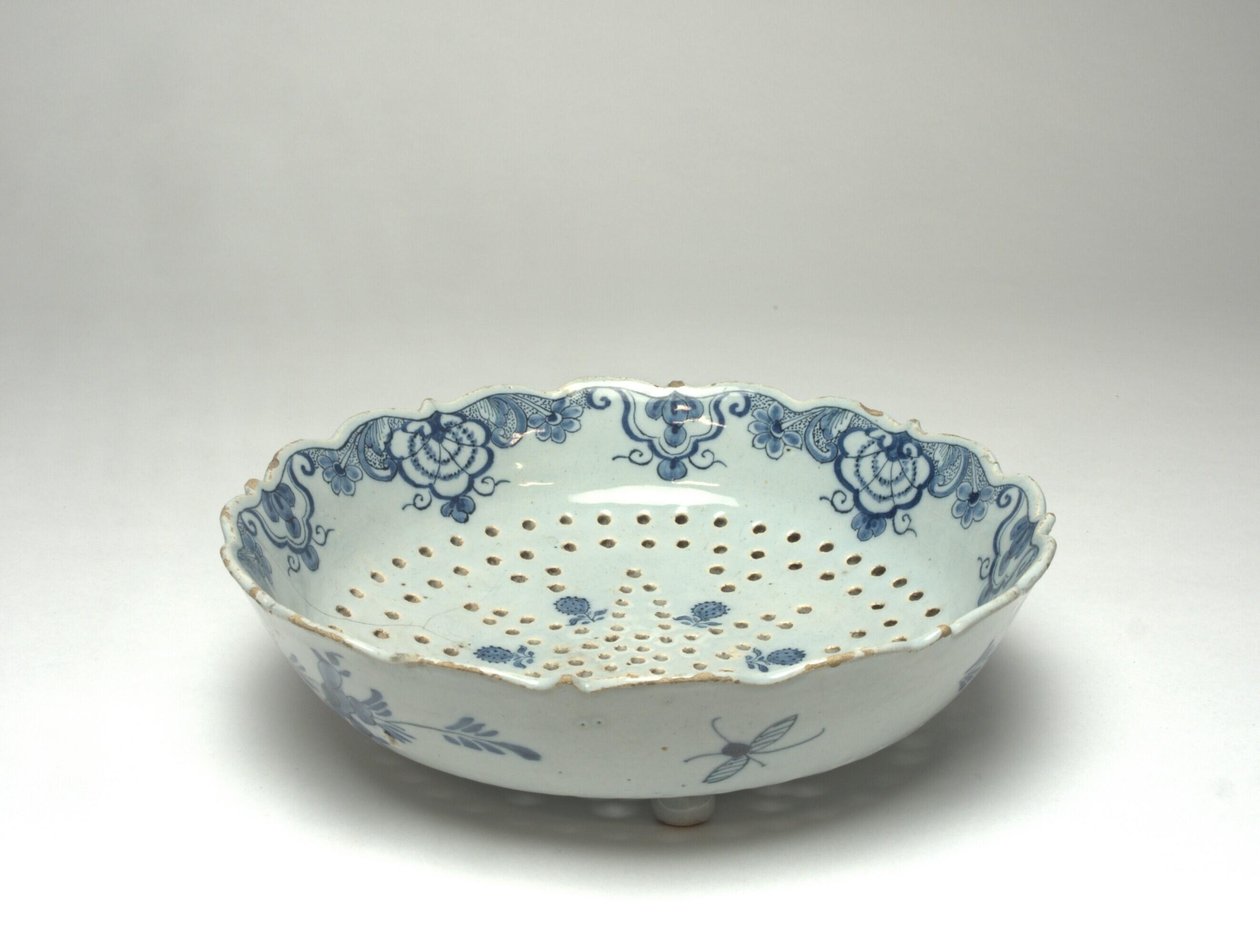 Ronde vergiet met accoladerand en rustend op drie knopvormige pootjes. De lekgaatjes vormen zespuntige ster omgeven door dubbele ring met binnenwaarts gerichte punten die tussen sterpunten steken. In het plat zes aardbeitjes, tegen de rand lambreq...