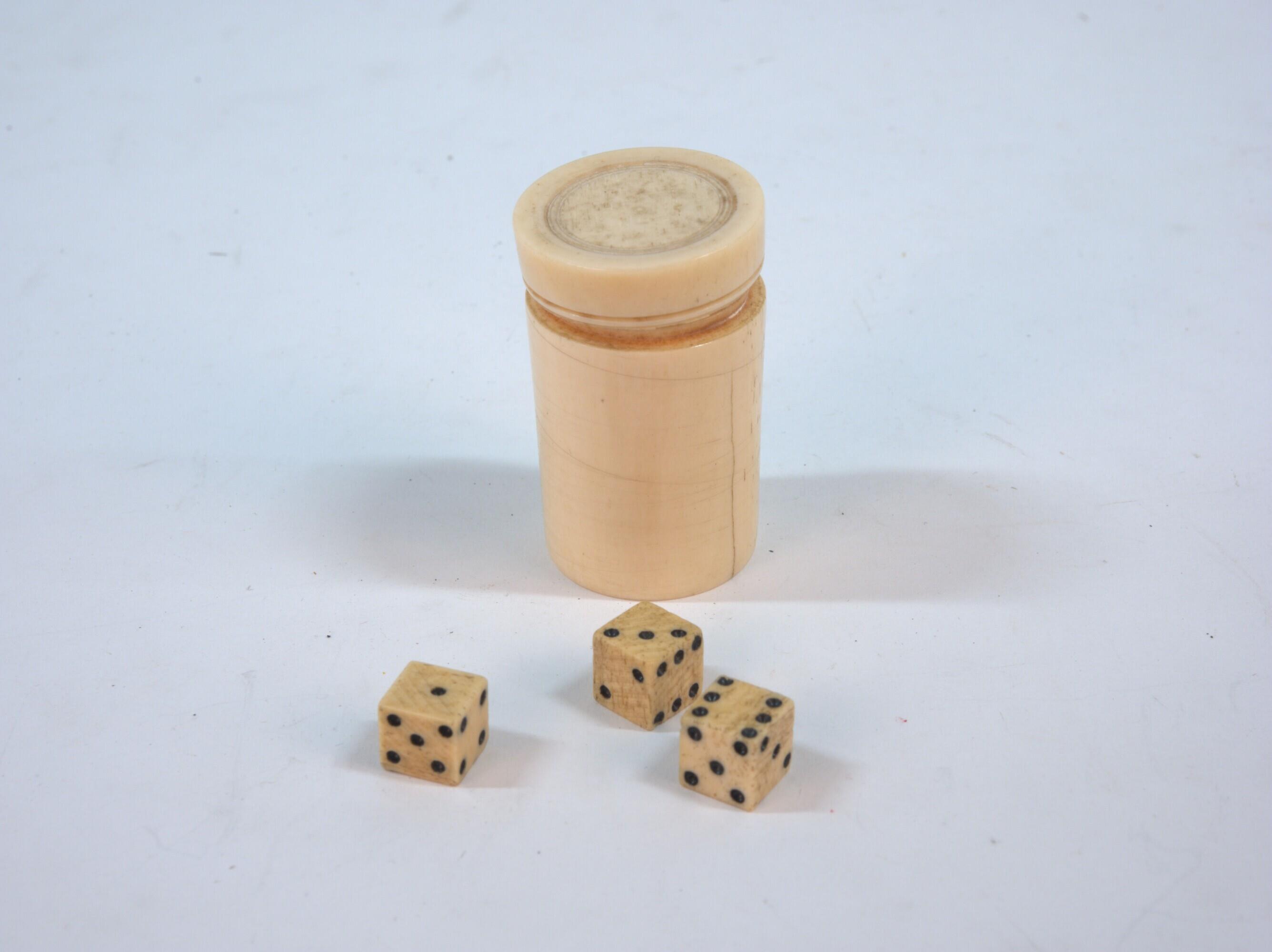 Klein, ivoorkleurig, cilindrisch busje met deksel, waarin zich 3 kleine dobbelsteentjes bevinden.