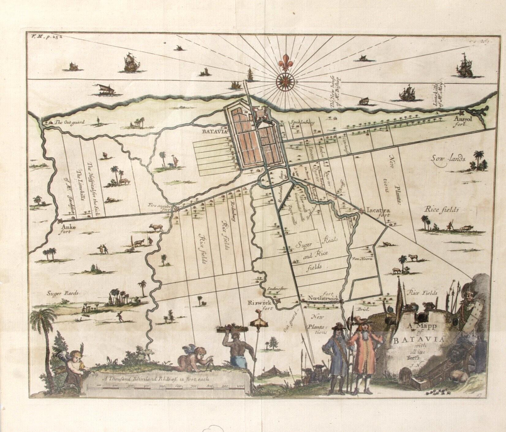 Plattegrond van Batavia met de omgeving en de zeven omliggende forten (van oost naar west) Ansyol, Iacatra, Northerwick, Riswick, Five Anguler fort, Anke fort; hierbij Sugar Reads and Rice fields en plantages en molens voor zagen, buskruit en papi...