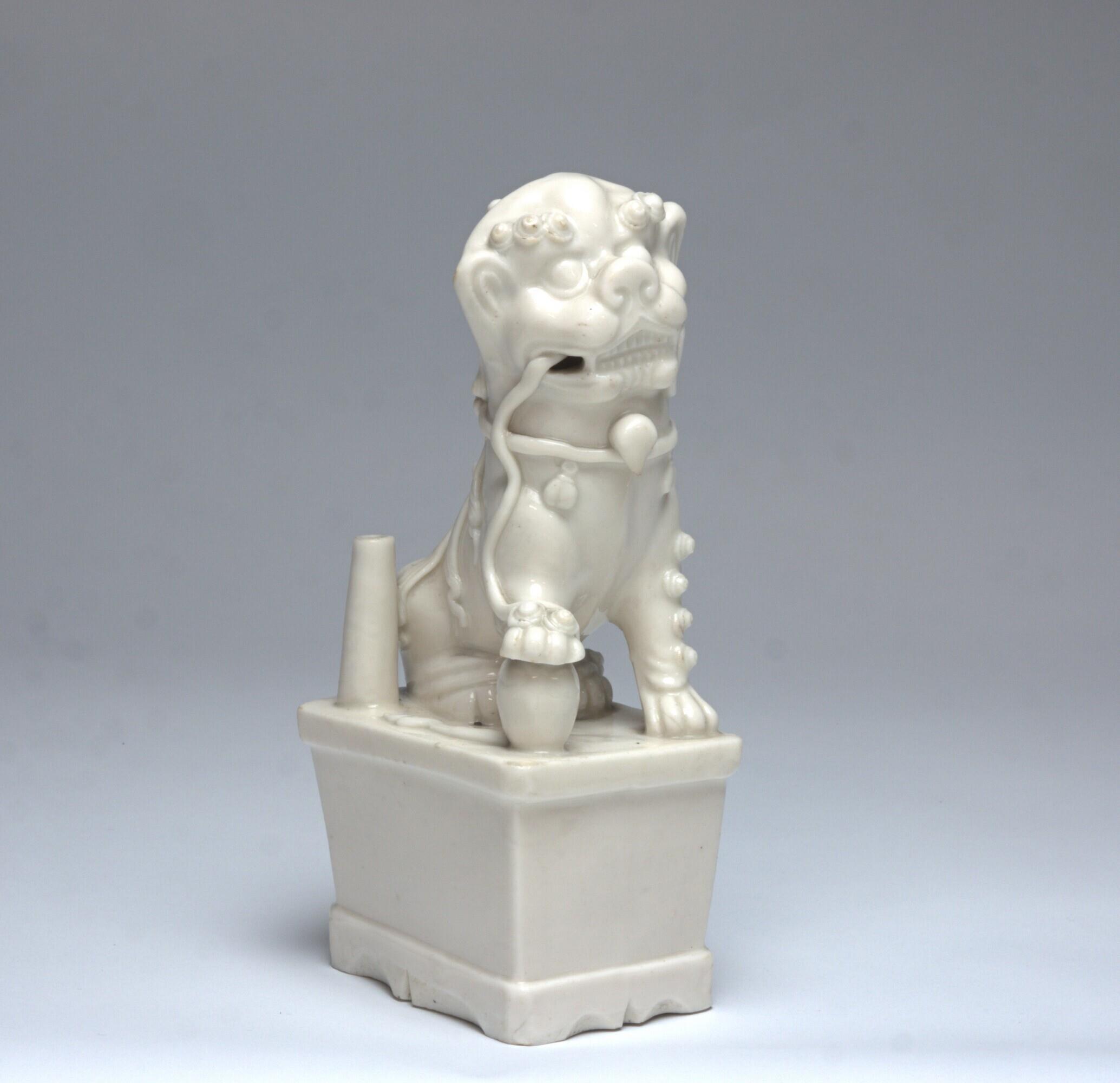 De blanc de Chine wierookstokjeshouder heeft de vorm van een boeddhistische leeuw op een sokkel. De leeuw bijt op een slang en heeft lange manen en een bal onder de rechter voorpoot. Naast de rechter achterpoot bevindt zich het houdertje voor de w...