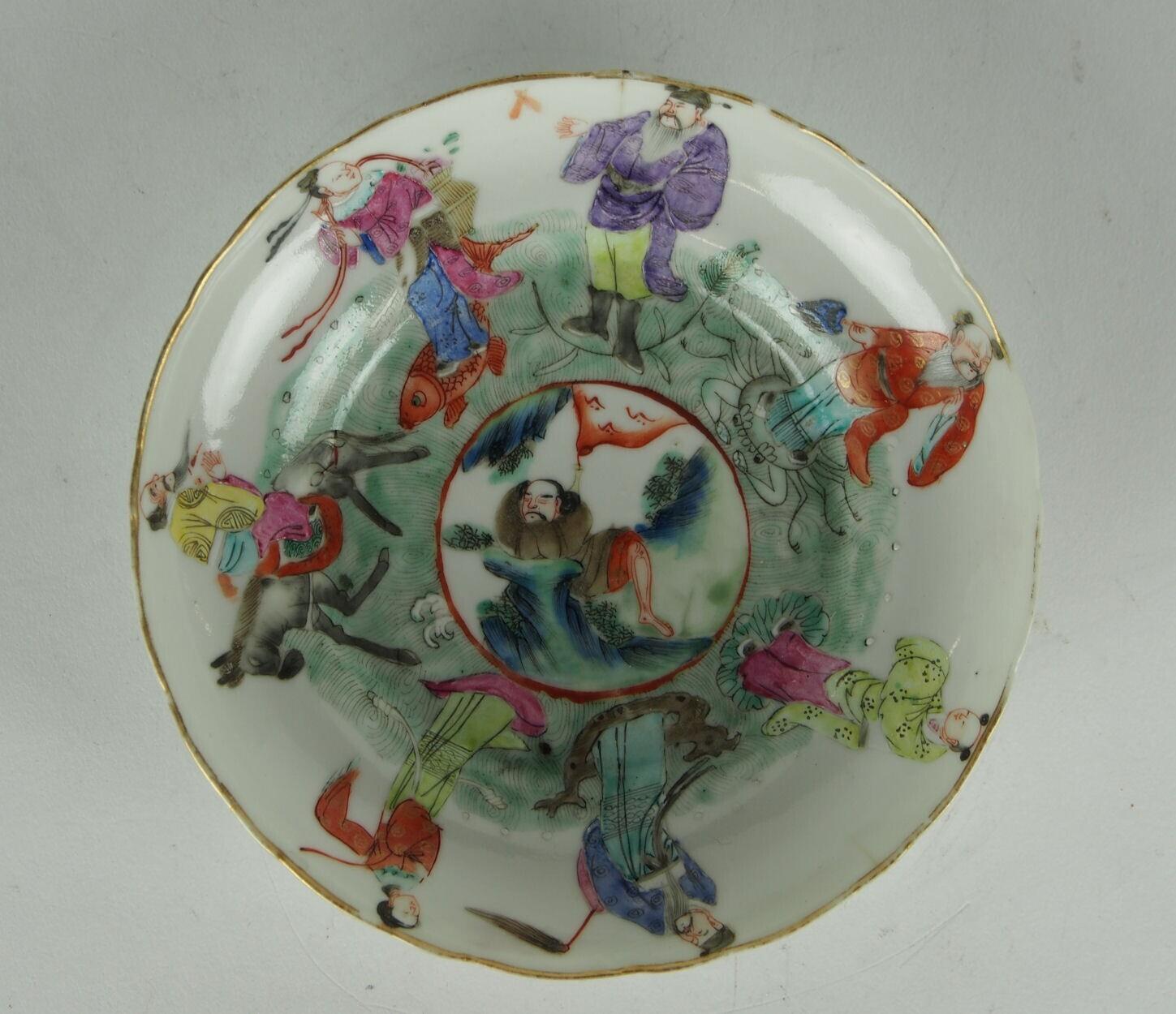 Het schoteltje heeft een standring en een brede, holle rand. Het plat heeft, binnen een enkele cirkel, een decor van een landschap met een rustende oosterse figuur. Daaromheen is een decor met zes staande oosterse figuren en een ruiter te paard....
