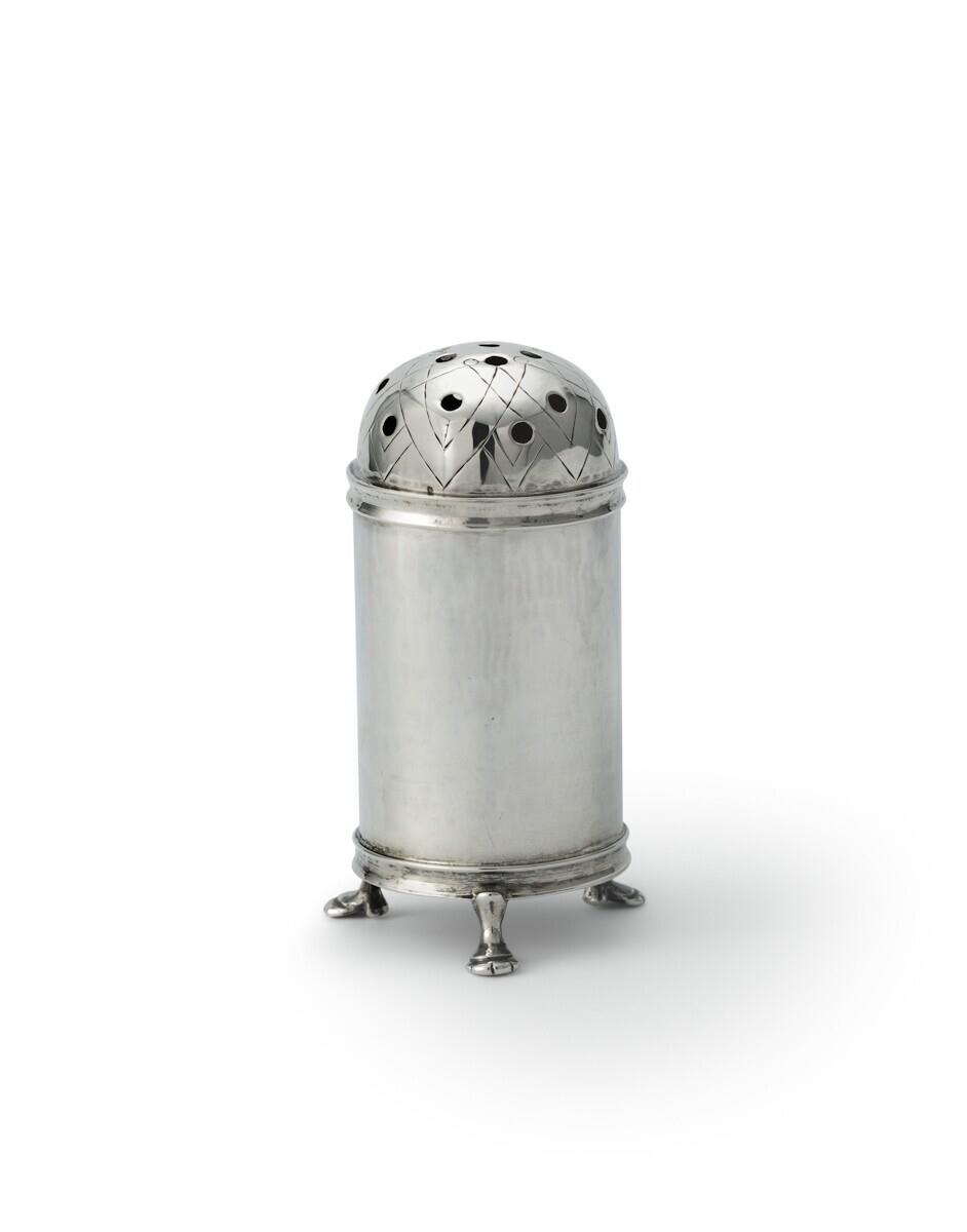 De bijzondere specerijen- of suikerstrooier is eenvoudig versierd met een gegoten profielrand. De dop heeft een gegraveerd ornament. De drie pootjes in de vorm van voetjes zijn later aangezet met tin.