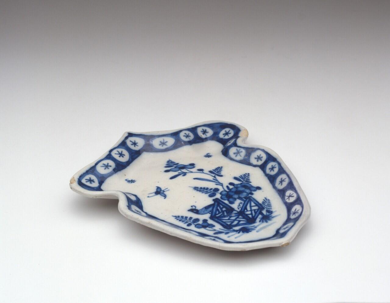 Schaaltje met aan één zijde een accoladevormige rand. Plat is versierd met een blauwe decoratie in onderglazuur voorstellende een landschap met hek, bloemtakken, vogel en insekt. Rand versierd met een band van sterretjes op een donkere grond.