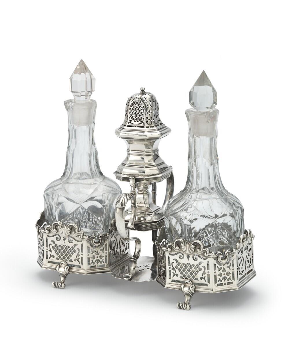 - Olie- en azijnstel met middenin een peperbus in Lodewijk XV-stijl met uitgezaagde ranken en schelpen