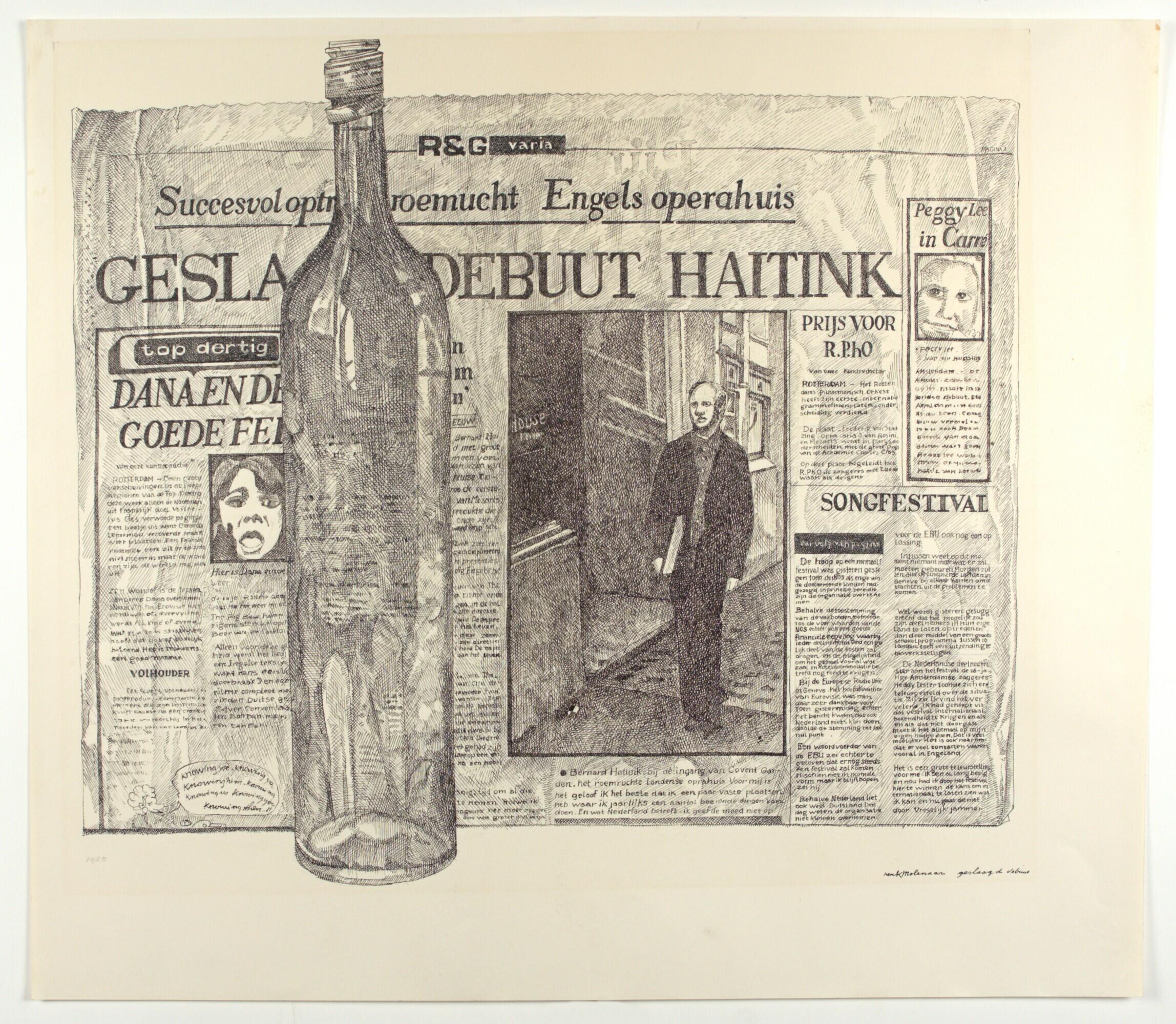 Beschrijving van het (kunst)werk: lege fles links van het midden met daarachter een krant met als kop GESLAAGD DEBUUT HAITINK