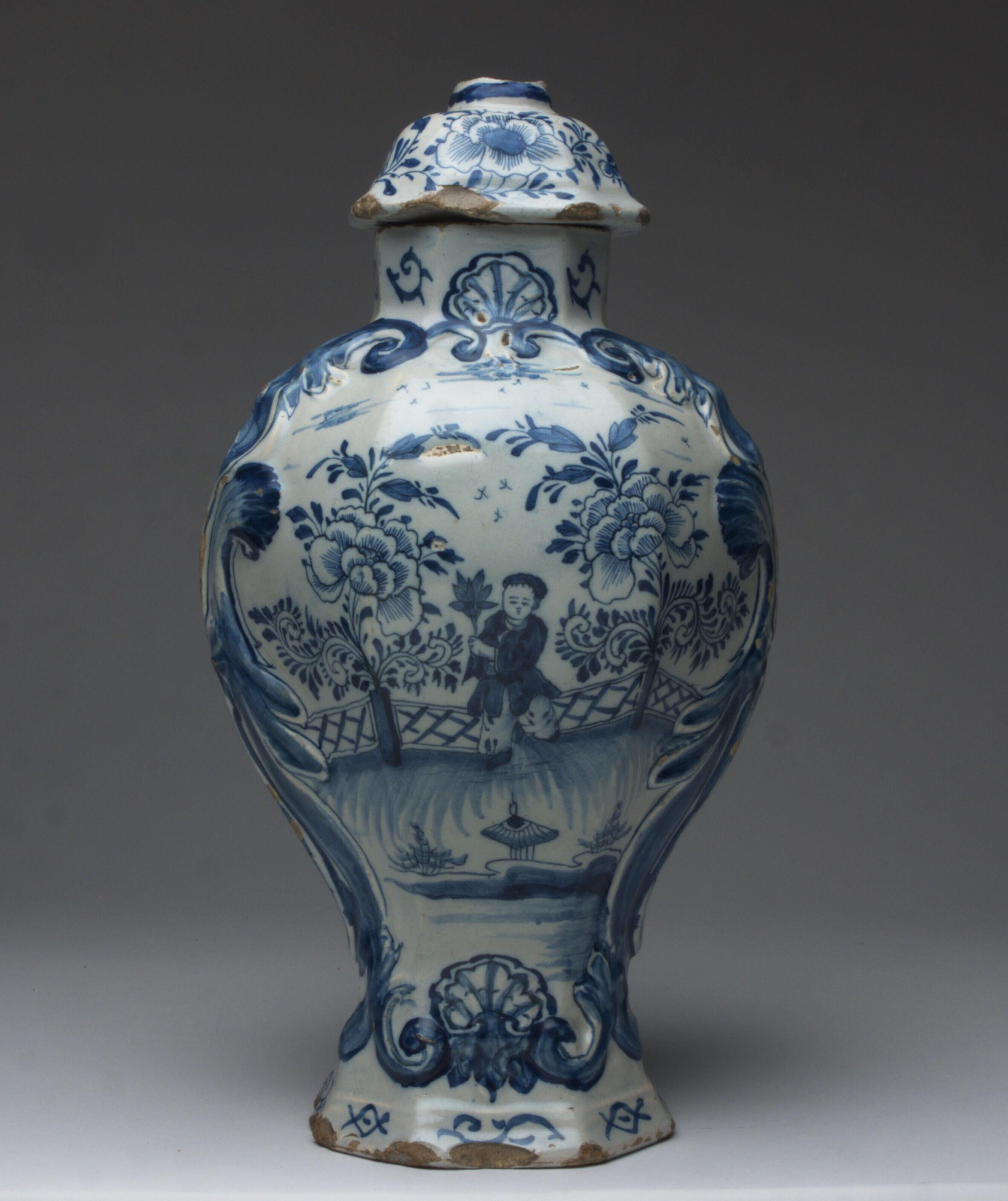 Balustervormige, achtzijdige dekselvaas, met gewelfd deksel, met in geprofileerd, blauw cartouche met lofwerk een staande Chinees, een zogenaamd 'zotje', voor hek tussen hoge bloemen, voorgrond paviljoentje aan vijver.