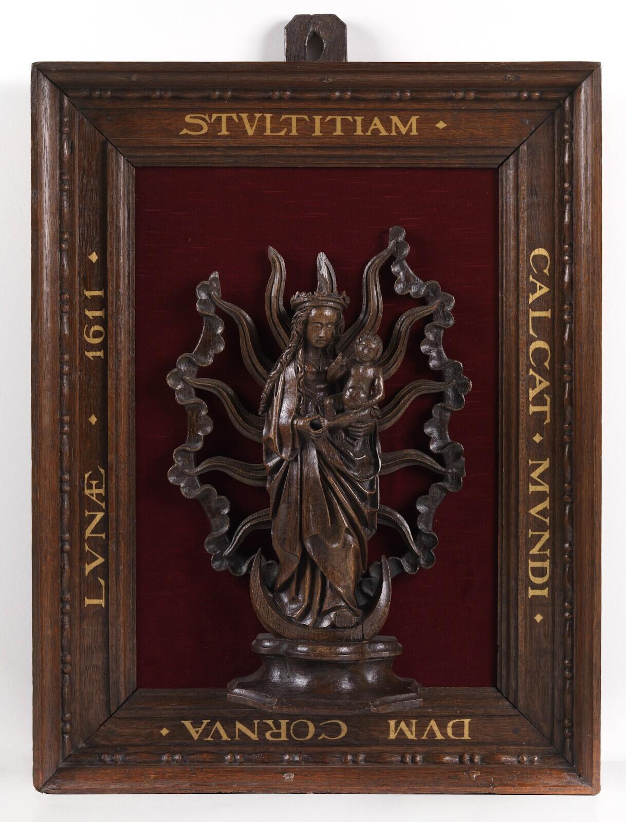 Gekroonde Maria, staande op maansikkel (symbool van haar kuisheid) in stralenkrans, met naakt, wereldbol dragende Kind op de arm. Waarschijnlijk onderdeel van een Marianum (beeld van Maria met Kind, omgeven door een stralenkrans en een krans van r...